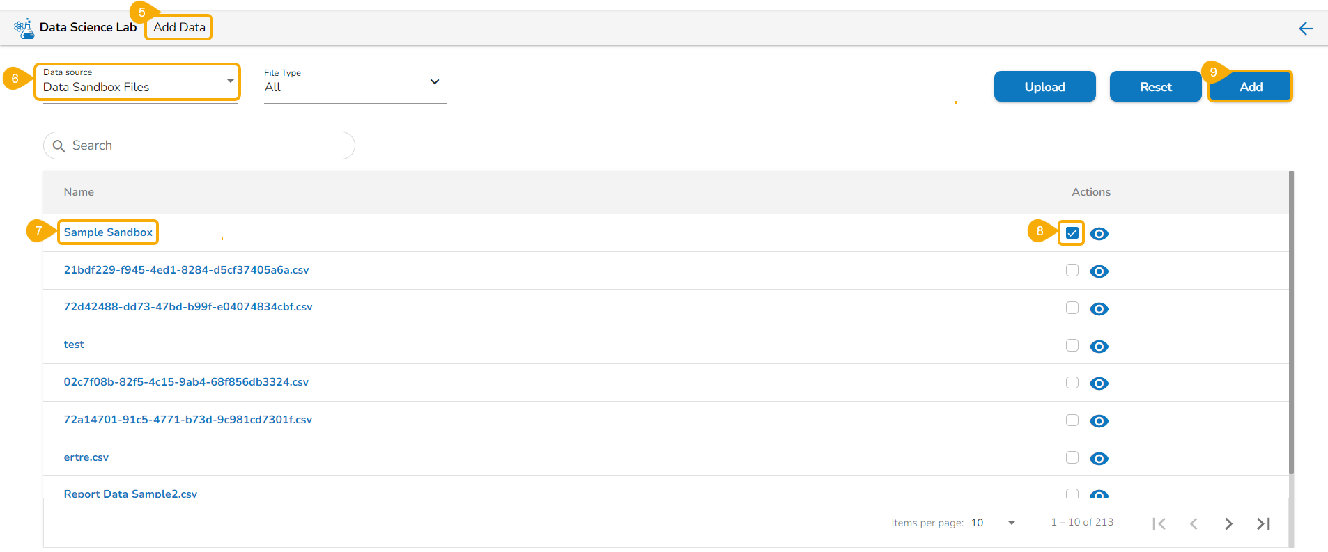 The Add option appears on the Add Datasets page only after selecting a Data source (For the given example, it is a Data Sandbox).