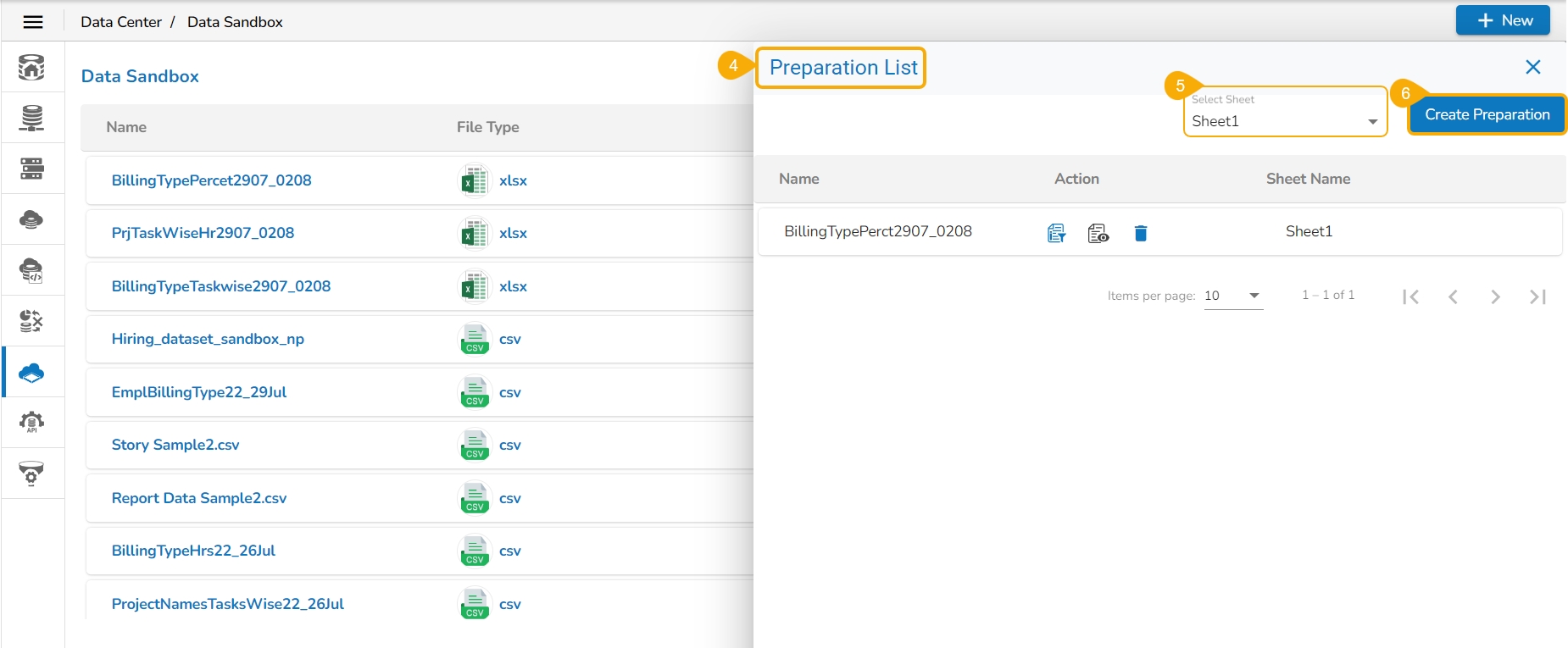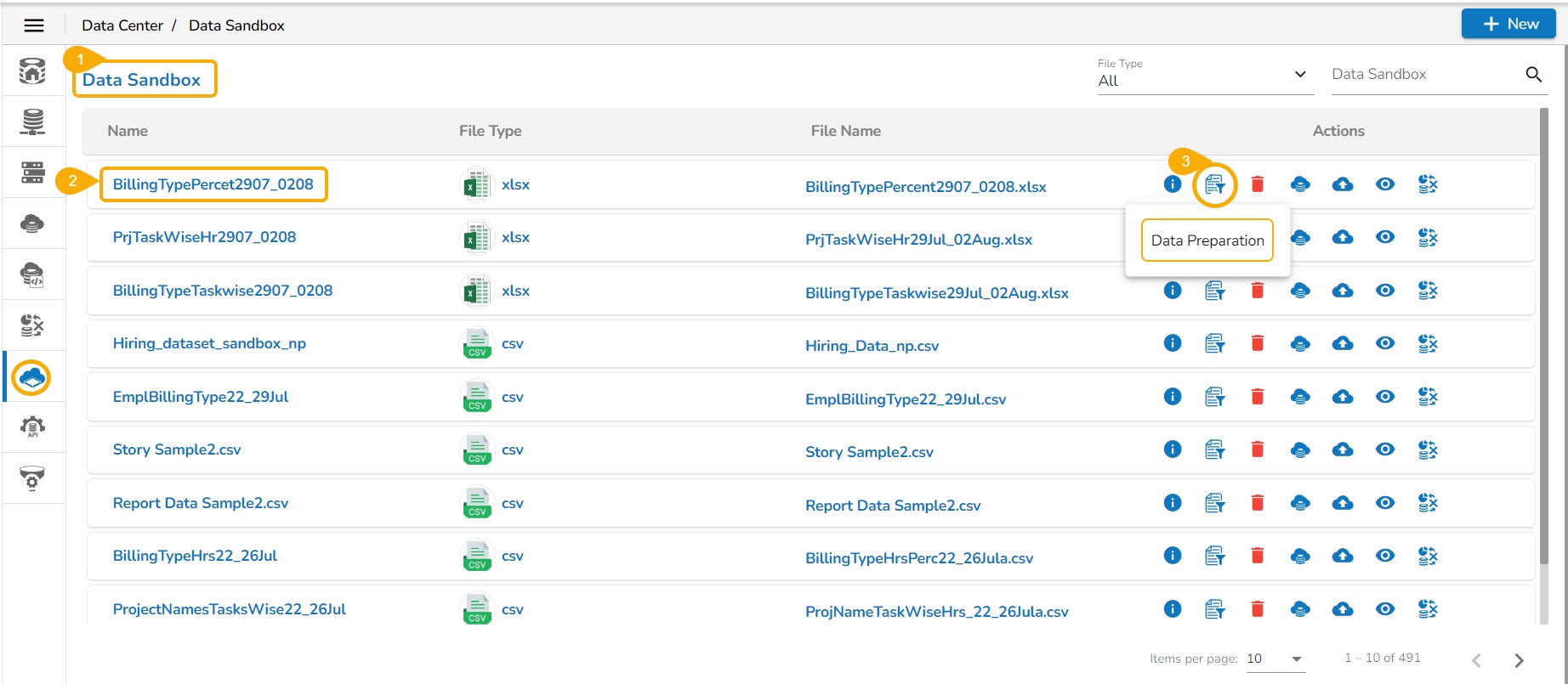 This page displays steps to access the Data Preparation workspace for a selected Data Sandbox file.