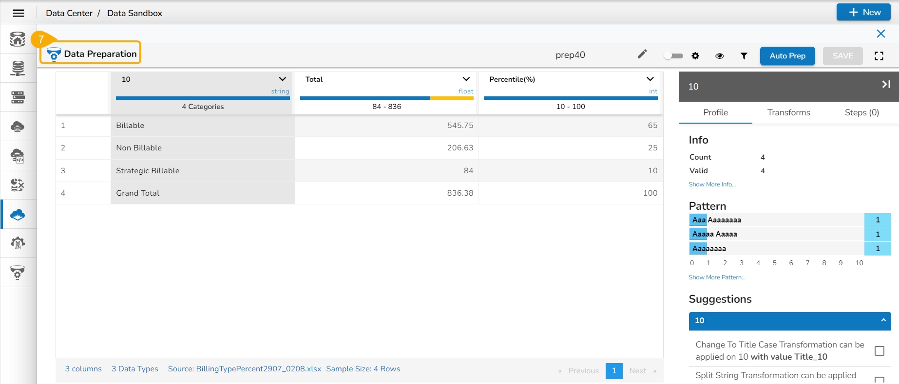 The data of the selected Data Sandbox file/ sheet gets displayed in the Data Preparation workspace.