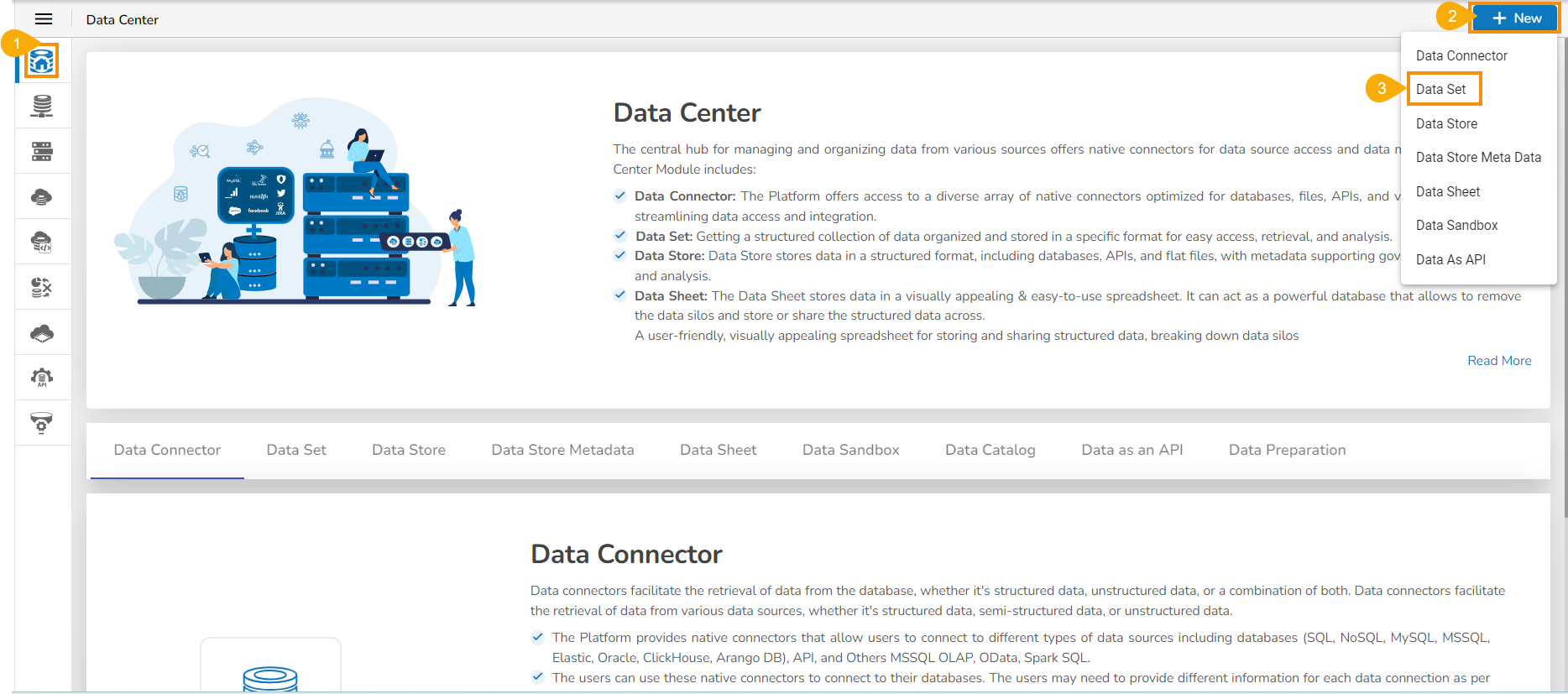 Click the Action/ Create Data Set (+) icon provided in the same row of the selected data connector.