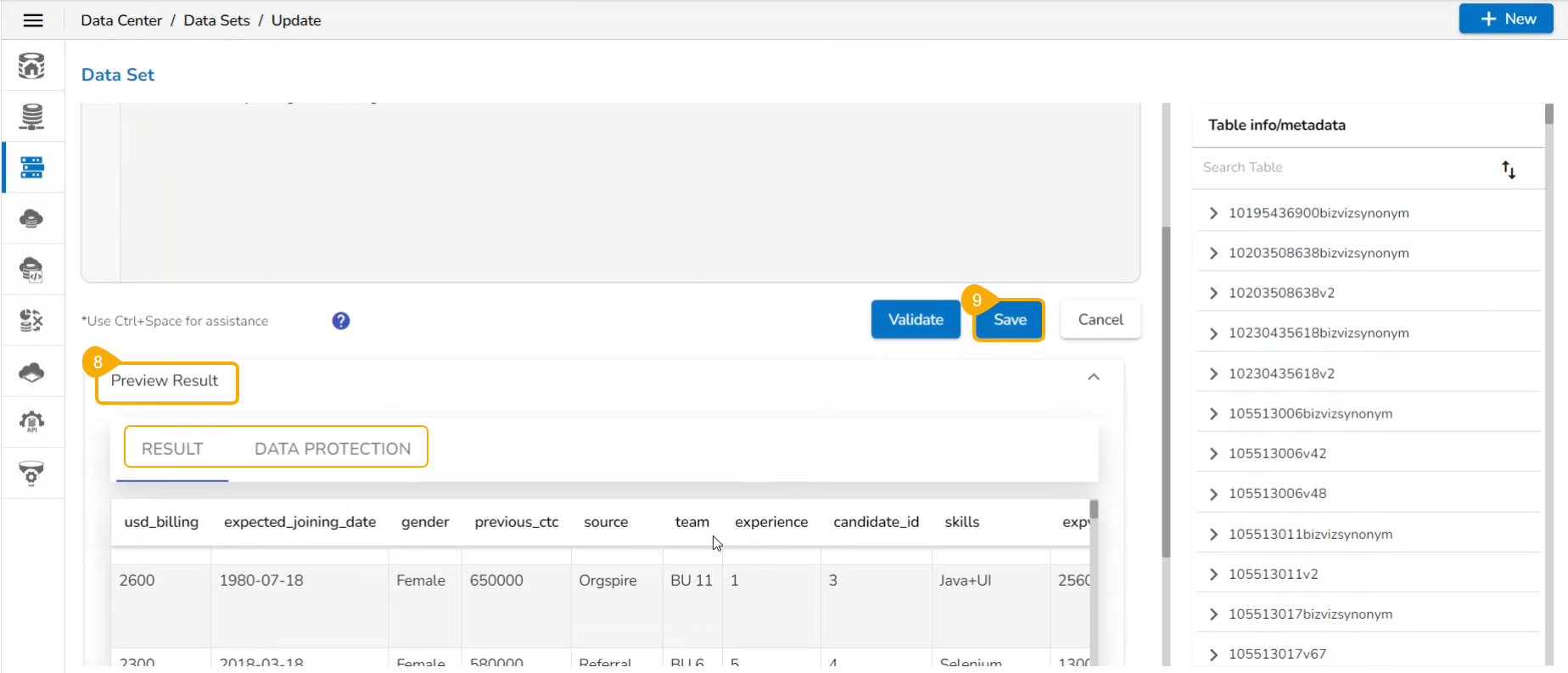 The Preview Result is displayed with the RESULT and DATA PROTECTION tabs.