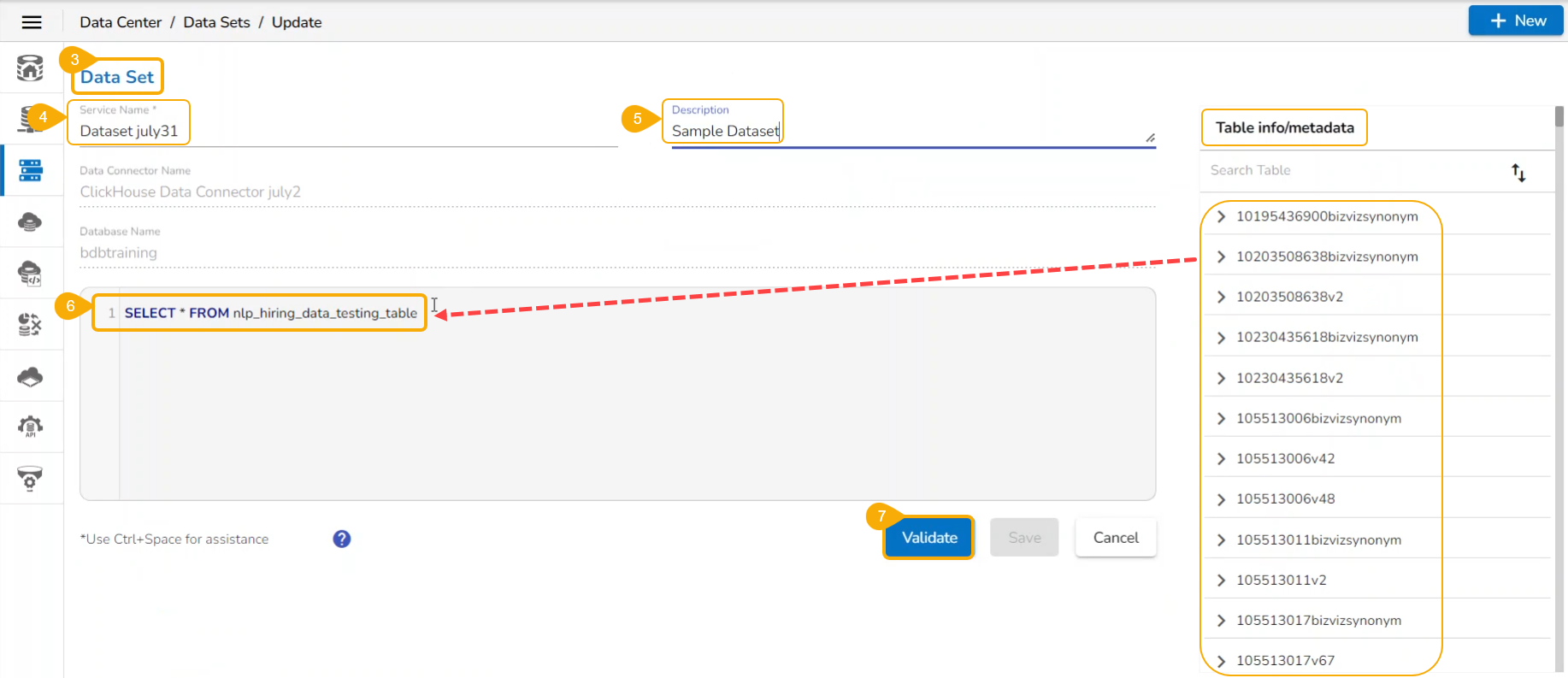For the Database category of the Data Sets, the user needs to Validate the information before saving it.