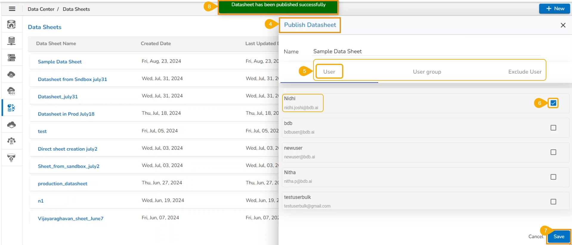 Select either the User or User group tab to share the published Data Sheet (Use the Exclude User tab to exclude any user from the rights to access a data sheet).