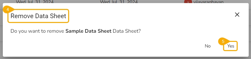 The Remove Data Sheet window opens to confirm the deletion of the selected Data Sheet.