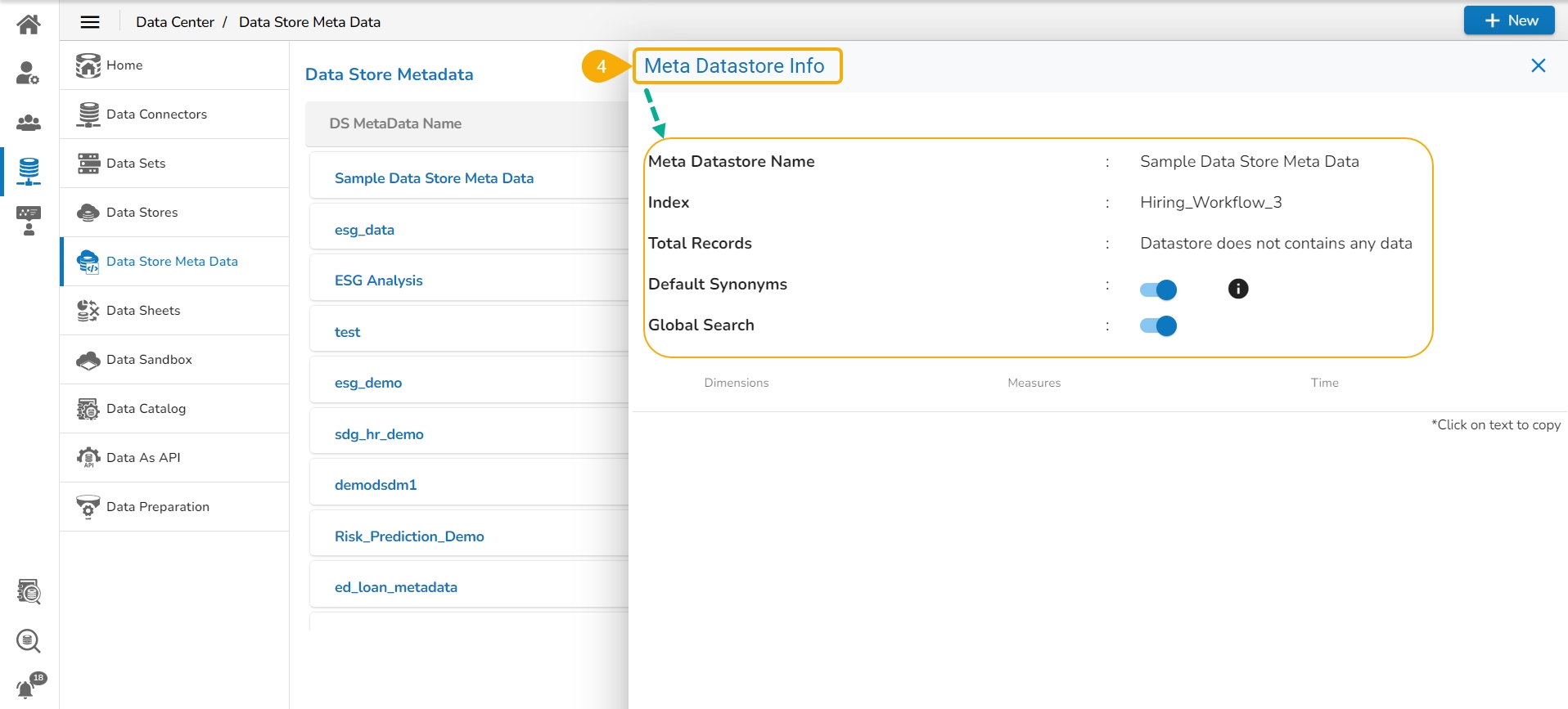 • The Datastore Info drawer also displays data broadly segregated as Dimensions, Measures, and Time values.