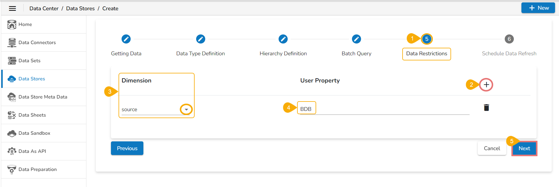 Please Note: The Administrator can restrict data access for specific users by configuring the User Property via the Data Restriction tab. For instance, if a custom field 'Country' is set to 'India' for a user or user group, and the administrator uses this field while creating a data store, only those users can access data related to India.