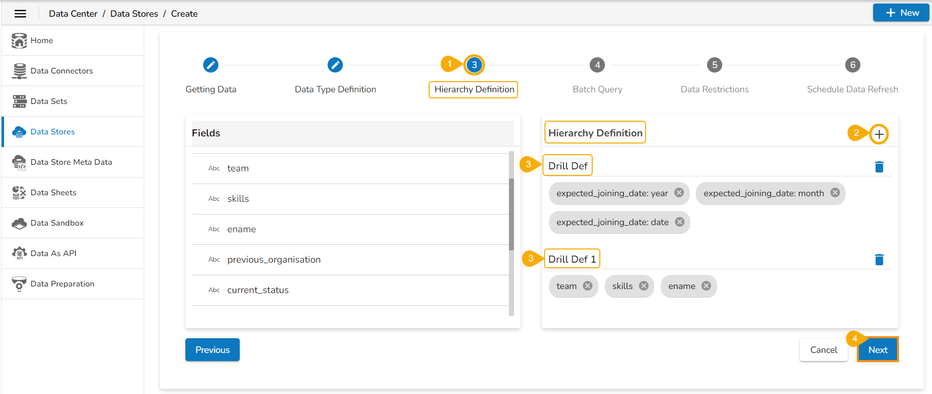 Users can define the data type using the selected data store. They can interchange the Dimensions, Measures, and Time fields by selecting the respective icons provided for these fields.