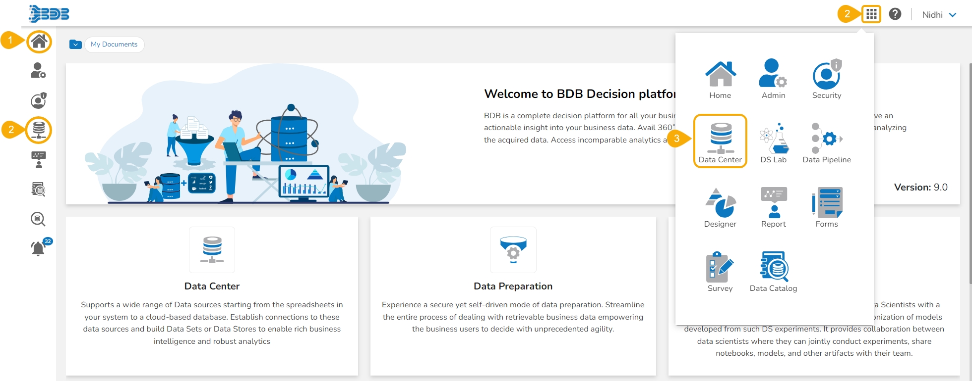 The user can also access a menu bar with icons to get the lists of the created Data Connectors, Data Sets, Data Stores, Data Store Meta Data, Data Sheets, Data Sandbox, Data Catalog, and Data as API on the left side of the Data Center homepage.
