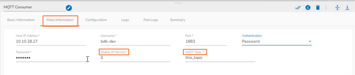 Configuring the Meta Information tab of the MQTT Consumer component: