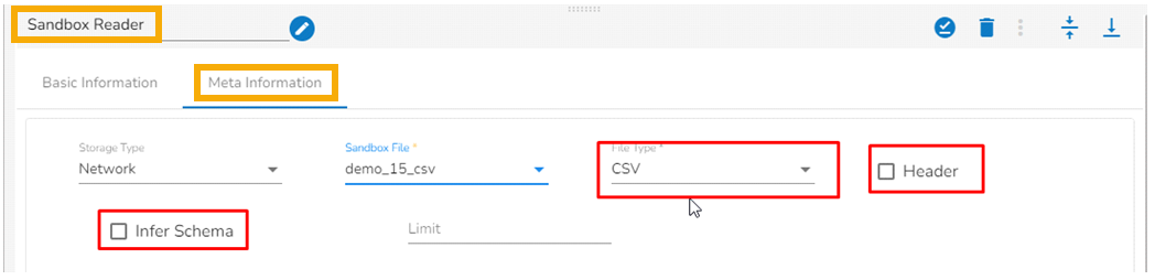 CSV: The Header and Infer Schema fields get displayed with CSV as the selected File Type. Enable Header option to get the Header of the reading file and enable Infer Schema option to get true schema of the column in the CSV file.