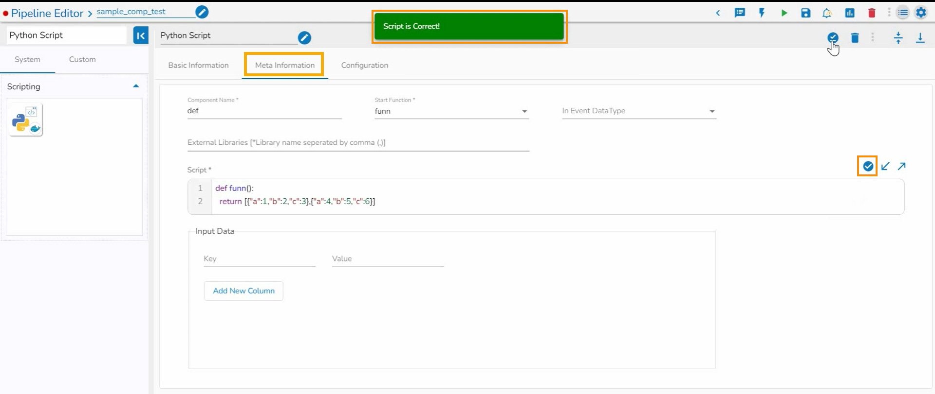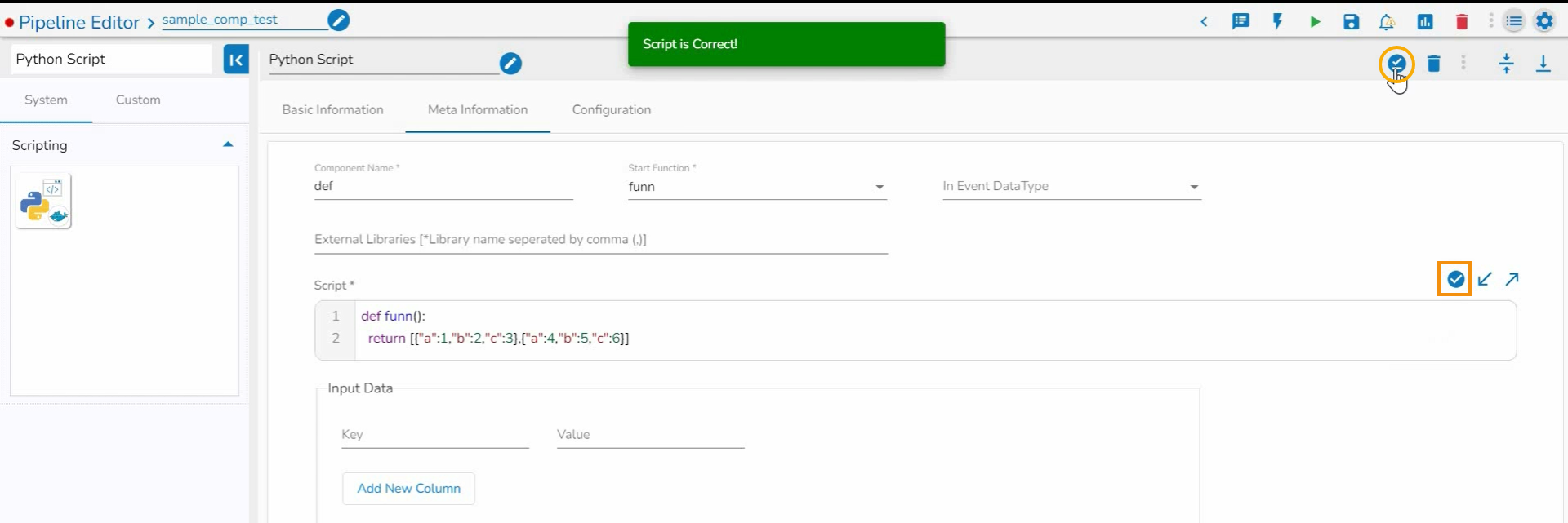 Please Note: Do not provide 'test' as a component name or the component name should not starts with 'test' in component name field in the Meta information of Python Script component. The word 'test' is being used at the backend for some development process.