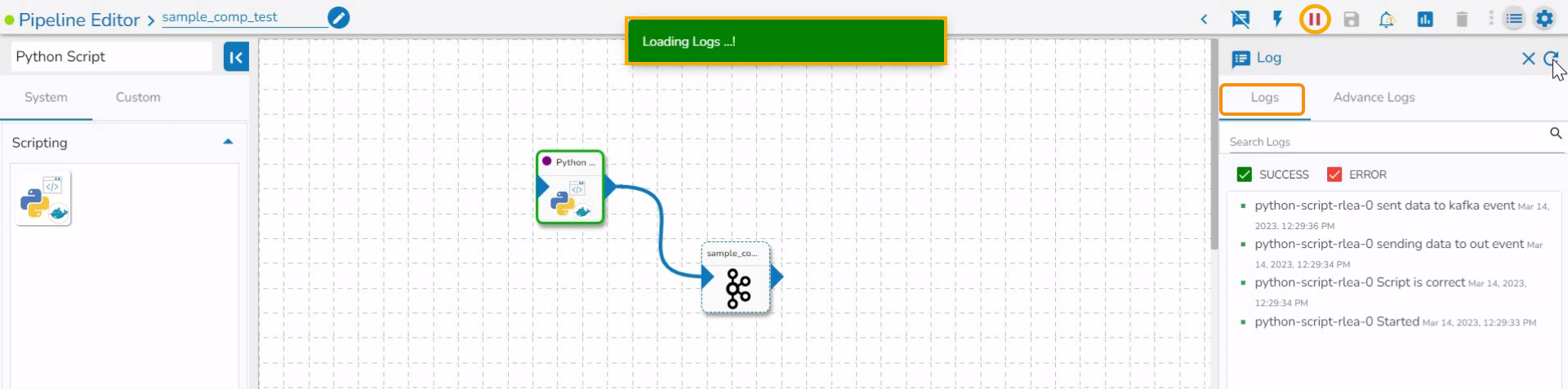 Python Component has custom logger feature which will be used in script for sending the user's custom logs in the logs panel. Please refer the below code for custom logger: