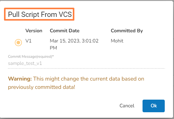 A notification message appears to inform the user that the available versions of the script are getting pulled from the VCS.