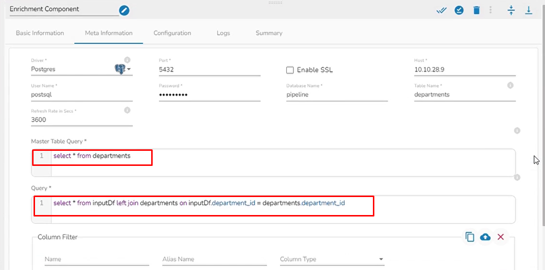 Open the ***Meta Information*** tab and fill in all the connection-specific details for the Enrichment Component.