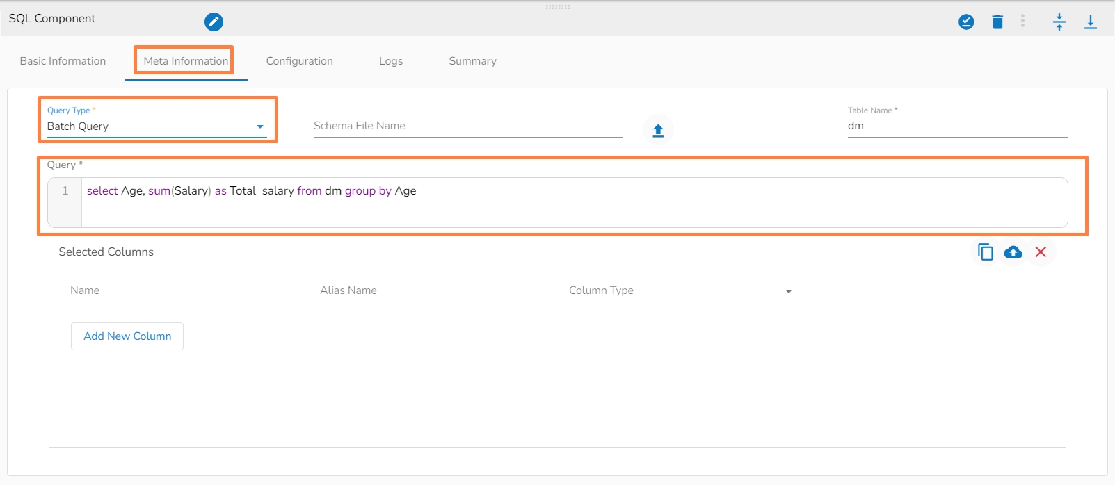 Configuring Meta Information of SQL Component.