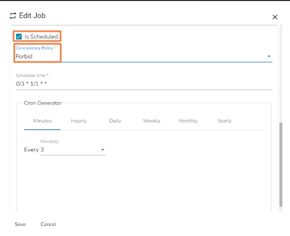 Allow concurrency policy Forbid: If a job is scheduled for a specific time and the first process is not completed before the next scheduled time, the next task will wait until all the previous tasks are completed.