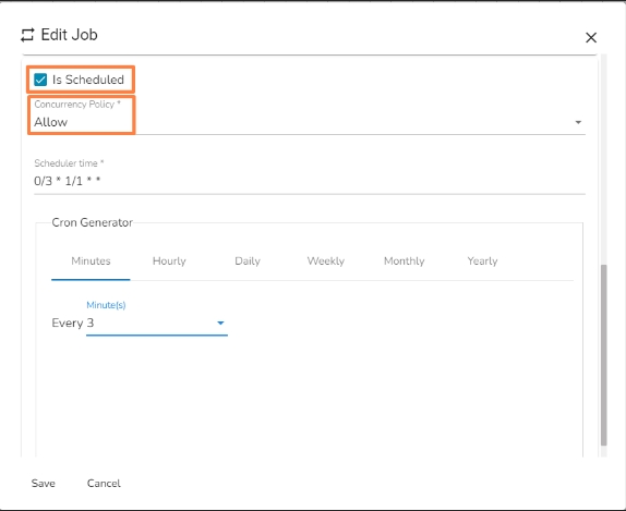 Allow: If a job is scheduled for a specific time and the first process is not completed before the next scheduled time, the next task will run in parallel with the previous tasks.