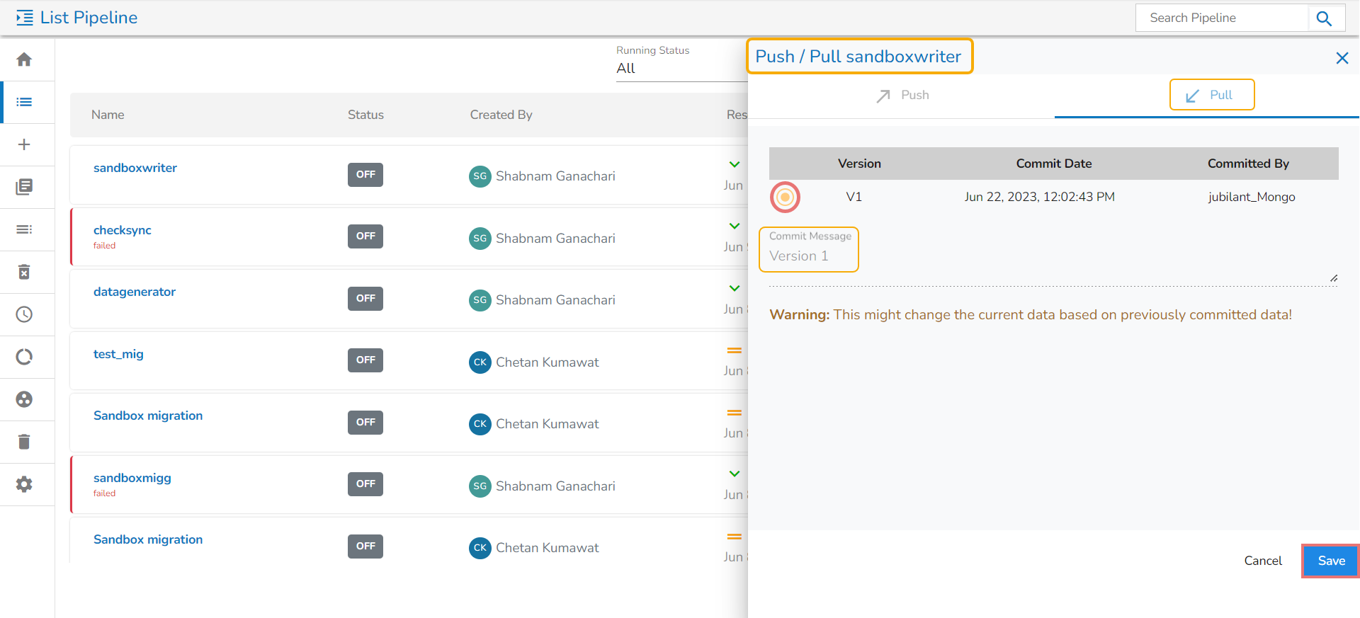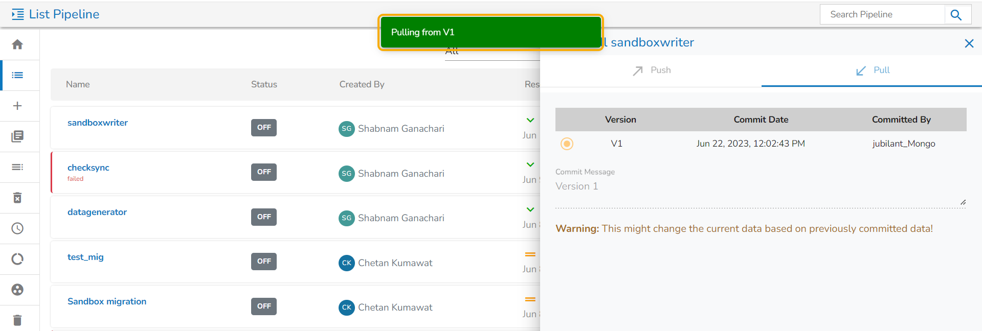 *<mark style="color:green;">Please Note:</mark> The pipeline that you pull will be changed to the selected version. Please make sure to manage the versions of the pipeline properly.*