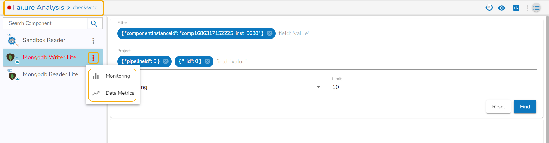 * Use the ellipsis icon to get redirected to the ***Monitoring*** and ***Data Metrics*** options for a component.