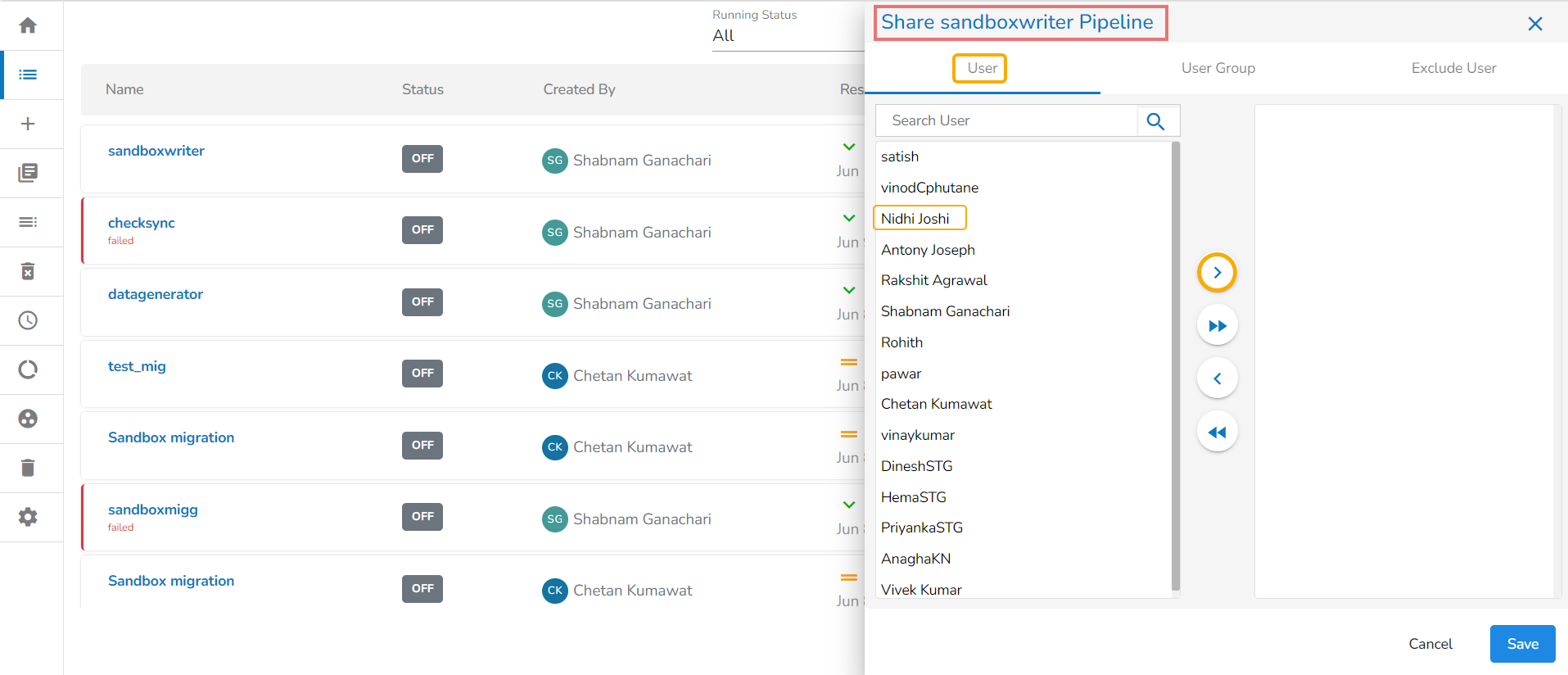 * The selected user(s)/user group(s) get moved to the box given on the right (In case of the ***Exclude User*** option the selected user/ the user moved to the right-side box looses the access of the shared pipeline).