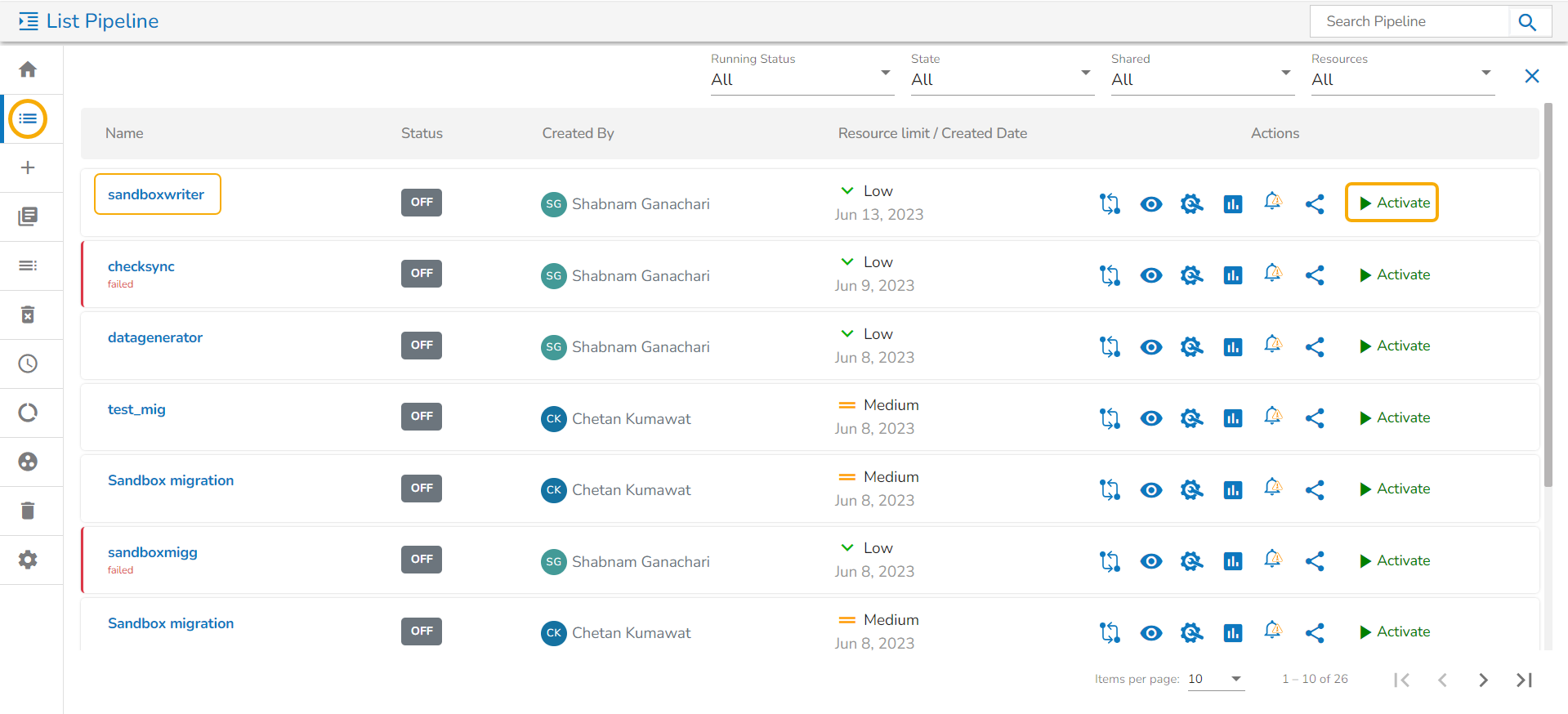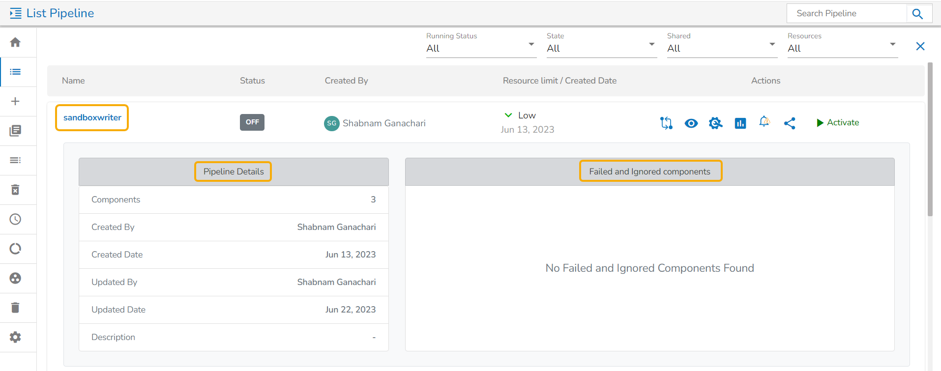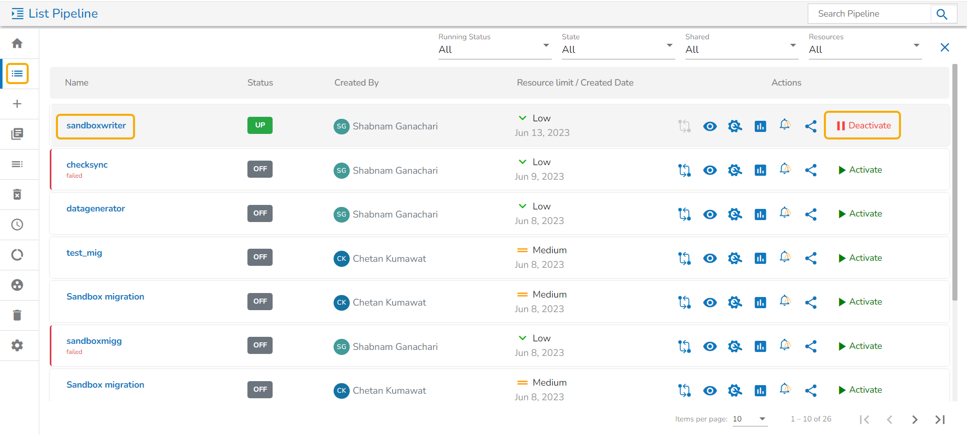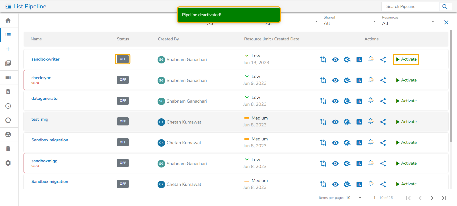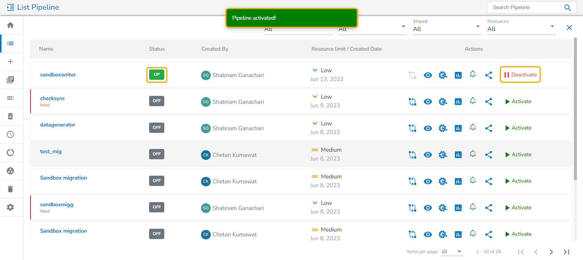 The user can activate/deactivate the pipeline by clicking on the Activate/ Deactivate icon.