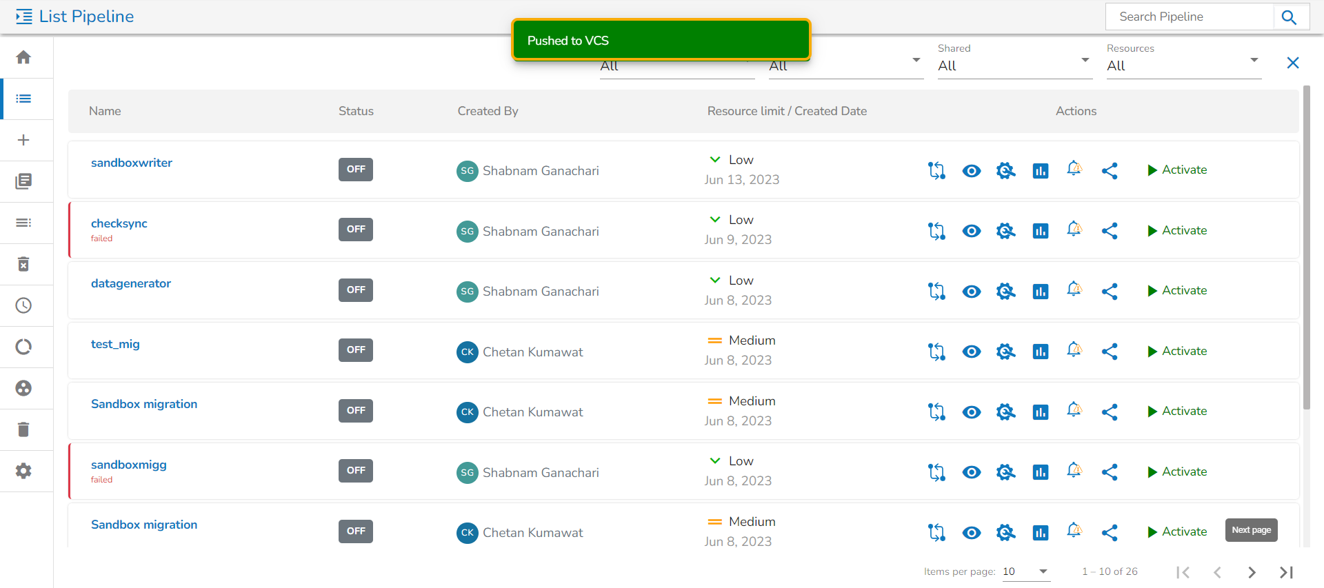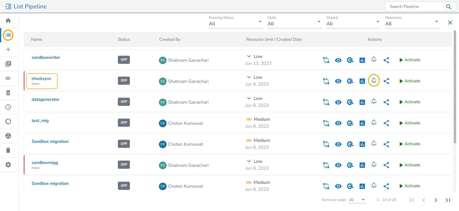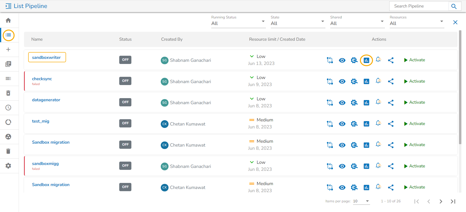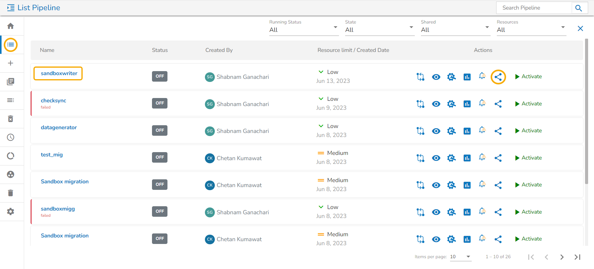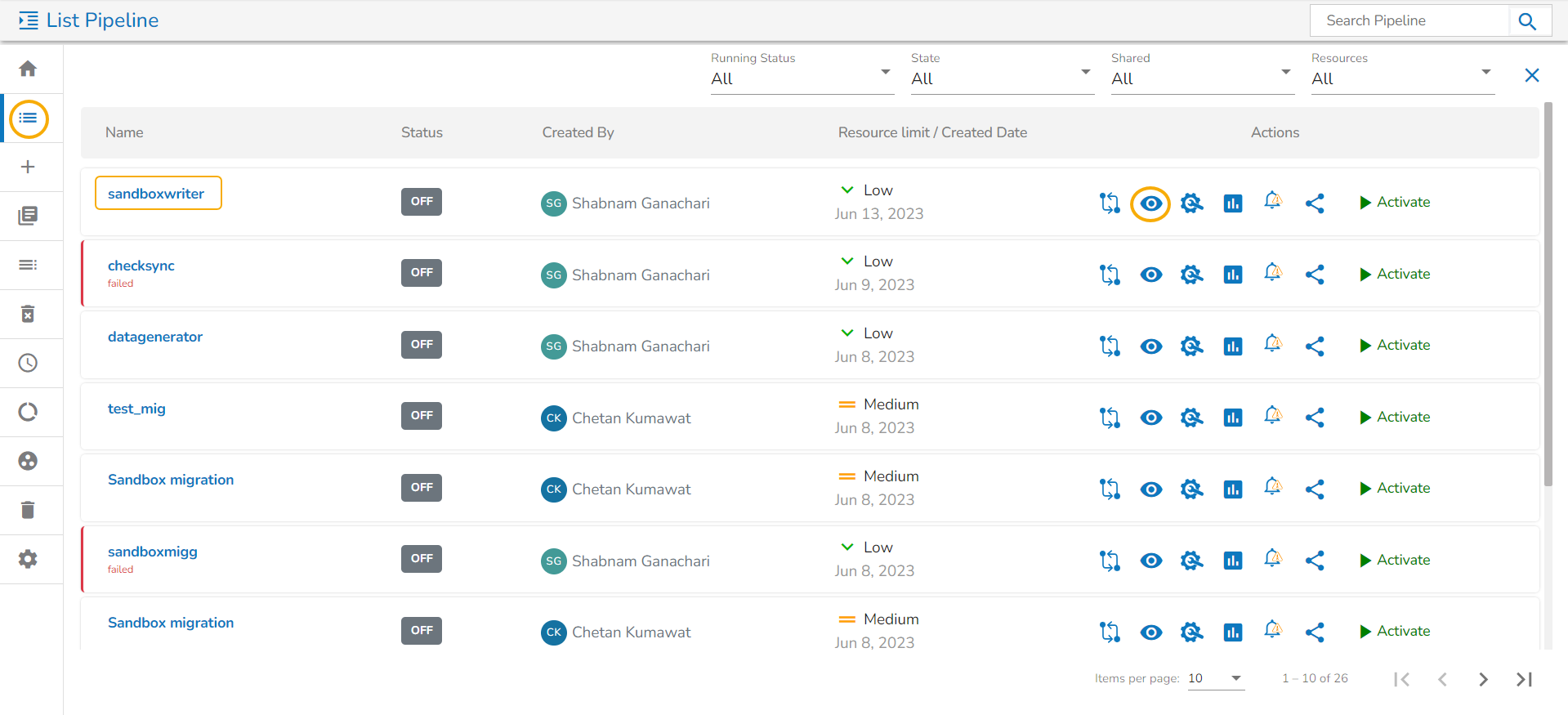 The user can activate/deactivate the pipeline by clicking on the Activate/ Deactivate icon.