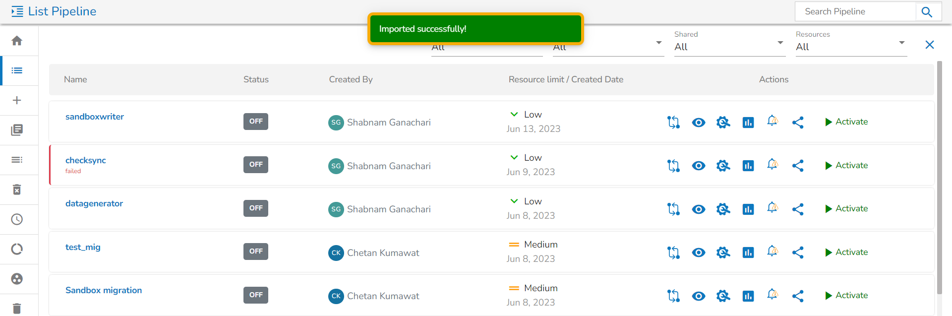 * Another notification appears to inform that the selected pipeline workflow is imported.&#x20;