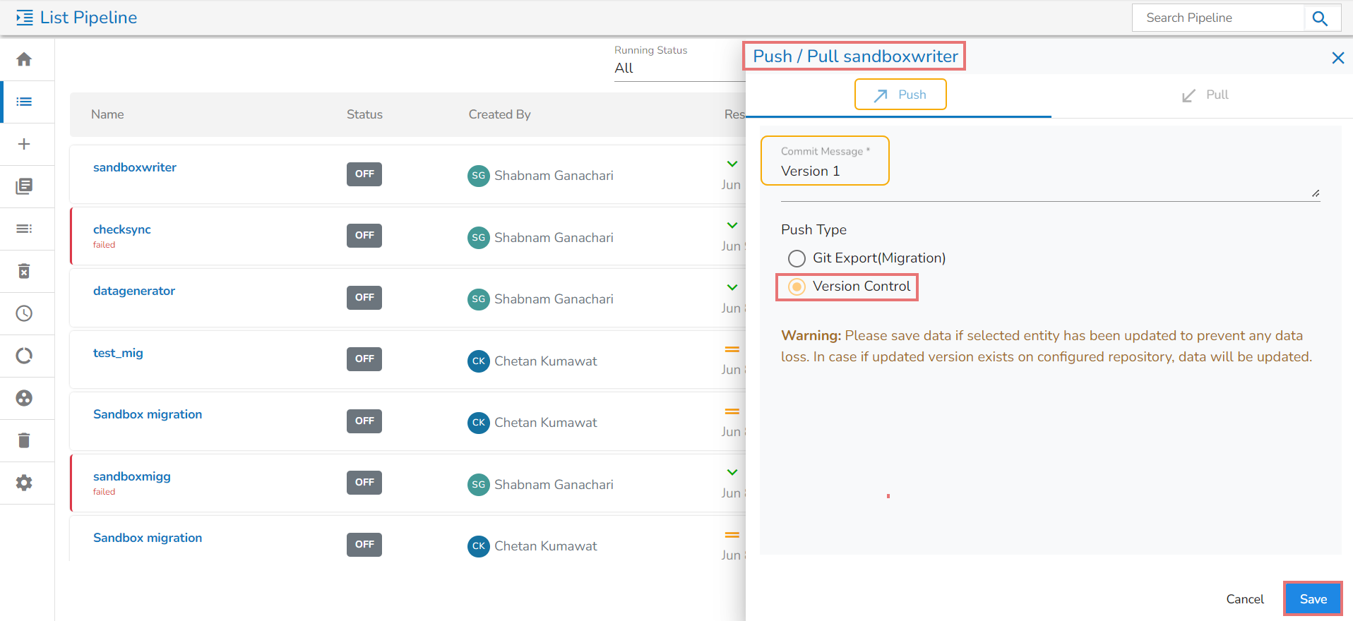 * *The user also gets an option to **Push the pipeline to GIT**. **This action will be considered as Pipeline Migration.** The user needs to follow the* [***Pipeline Migration*** ](https://app.gitbook.com/s/MEJKqXNSvcfKLo5znn53/admin-panel-options/git-migration/migrating-a-pipeline)*steps given the* [***Admin***](https://app.gitbook.com/o/BHXEmSpD7W3xDgxnOIpk/s/SuiyPYGtTJrg3jydU0rO/) ***module** of the Platform to **pull a version that has been pushed to GIT.***