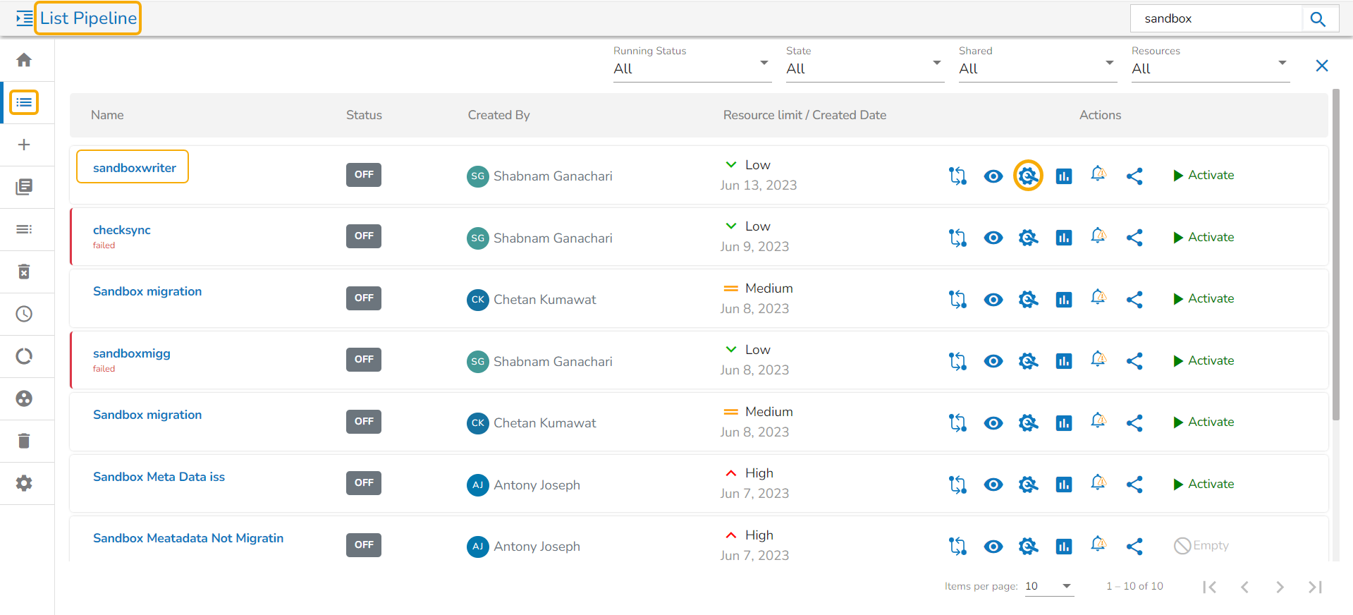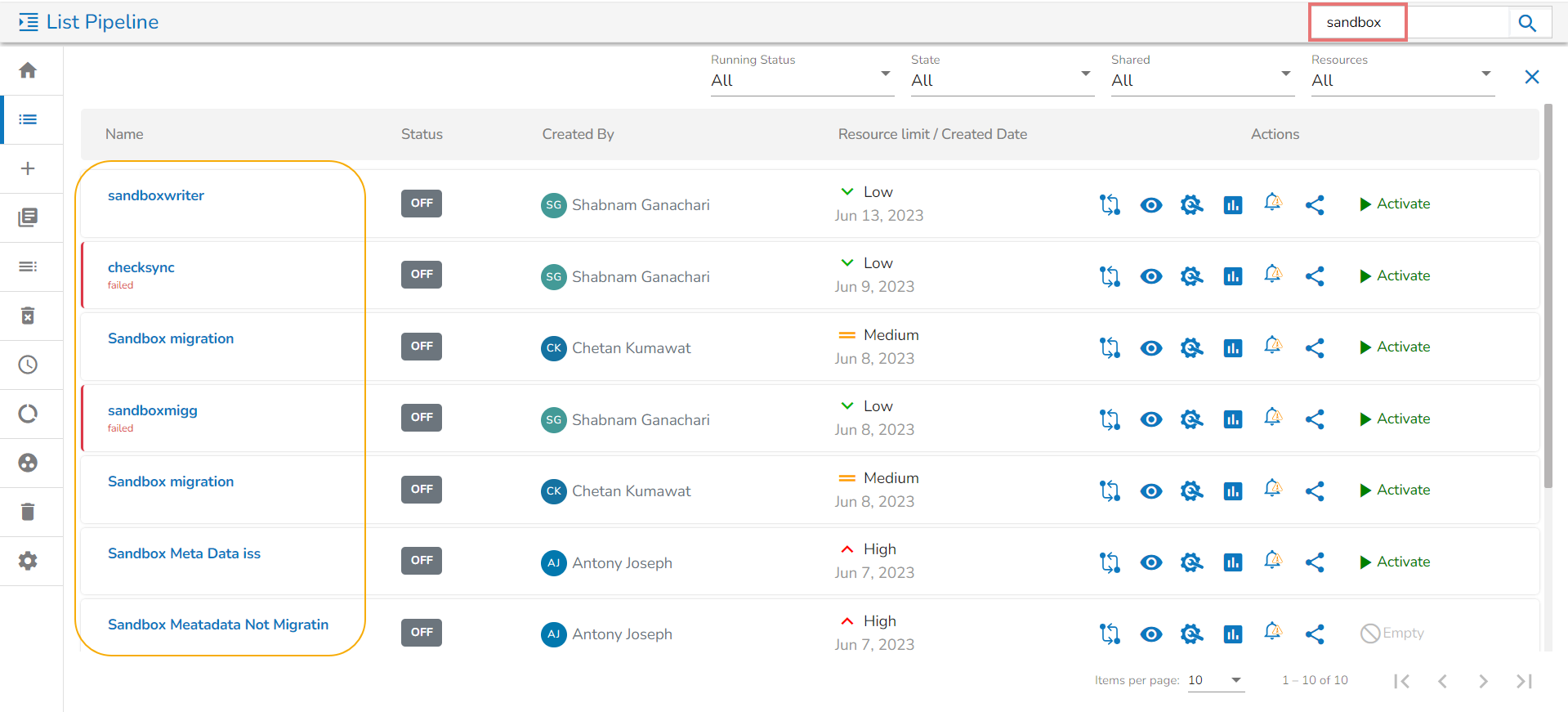 *The user can search for a specific pipeline by using the **Search bar** on the Pipeline List. By typing a common name all the existing pipelines having that word will list. E.g., By typing the word **sandbox** all the existing pipelines with that word get listed in the following image:*