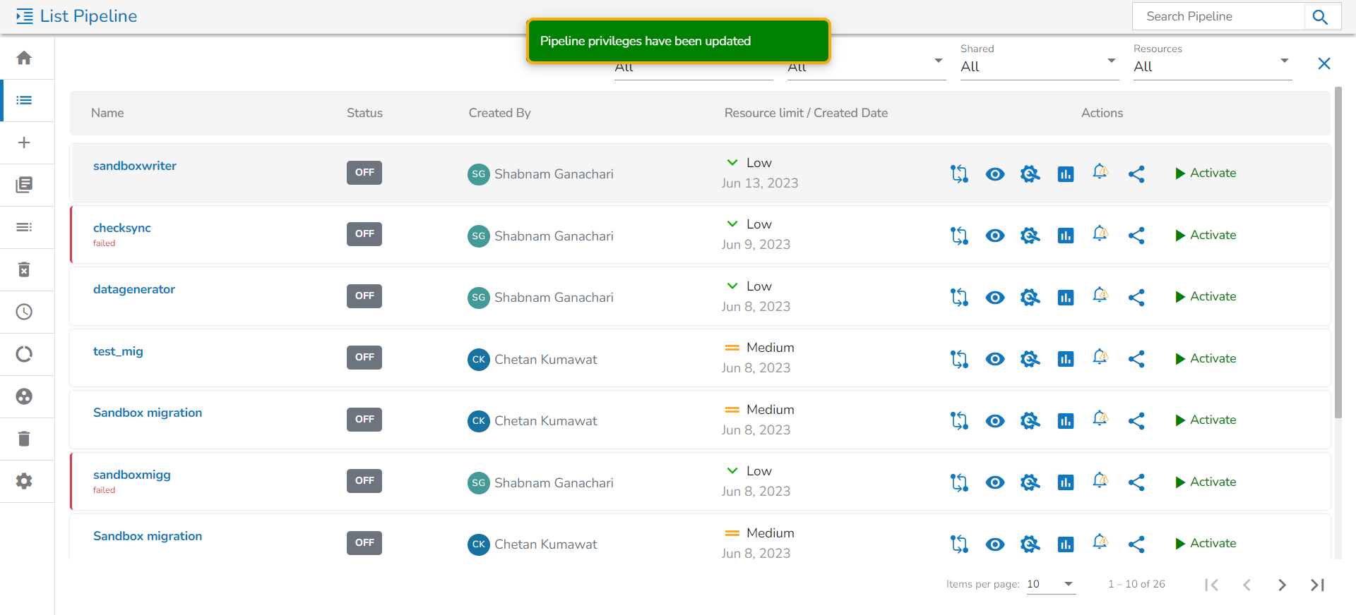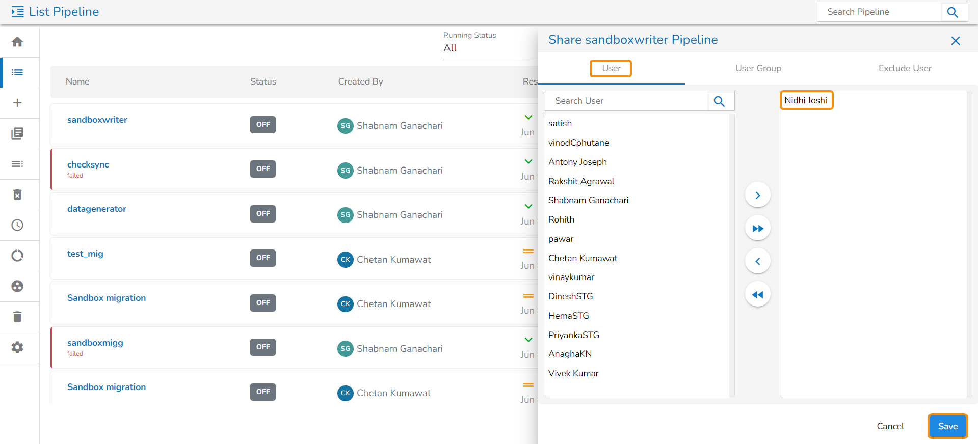 * By completing the steps mentioned above, the concerned pipeline gets successfully shared with the selected user/user group or the selected users can also be excluded from their privileges for the concerned pipeline.