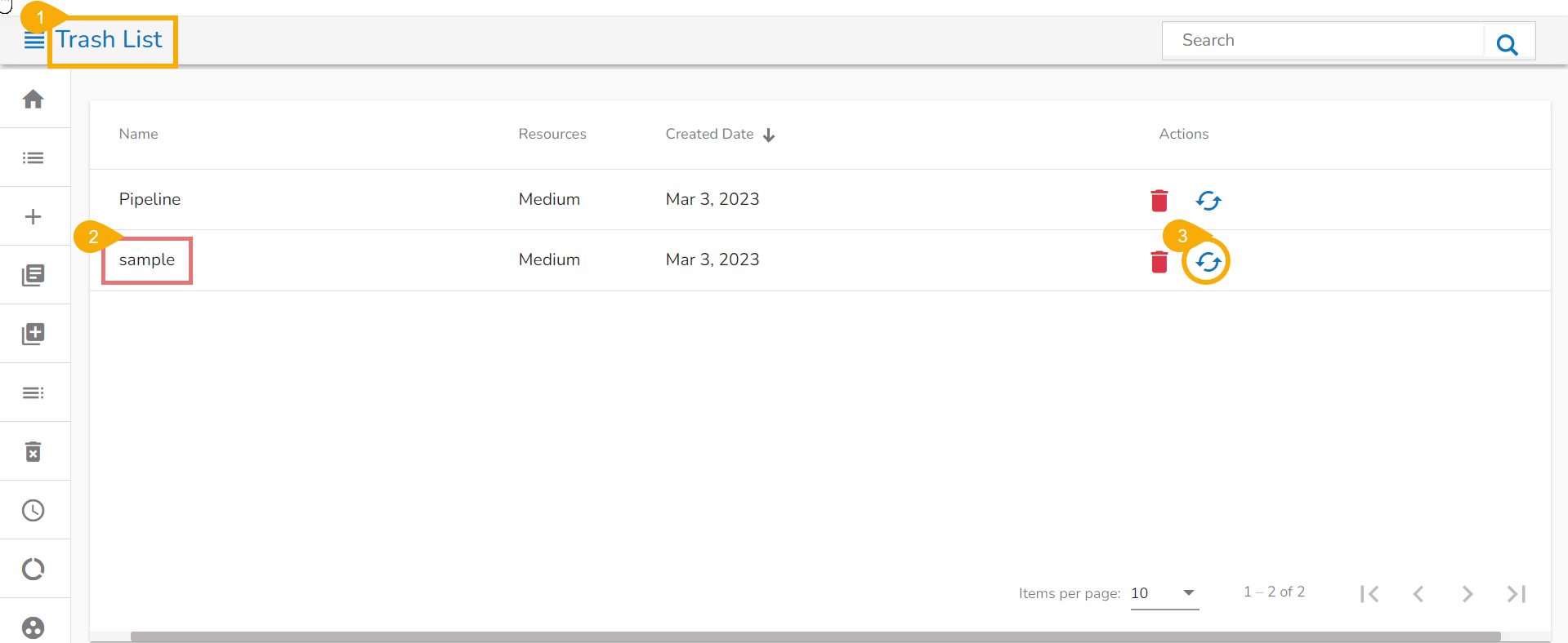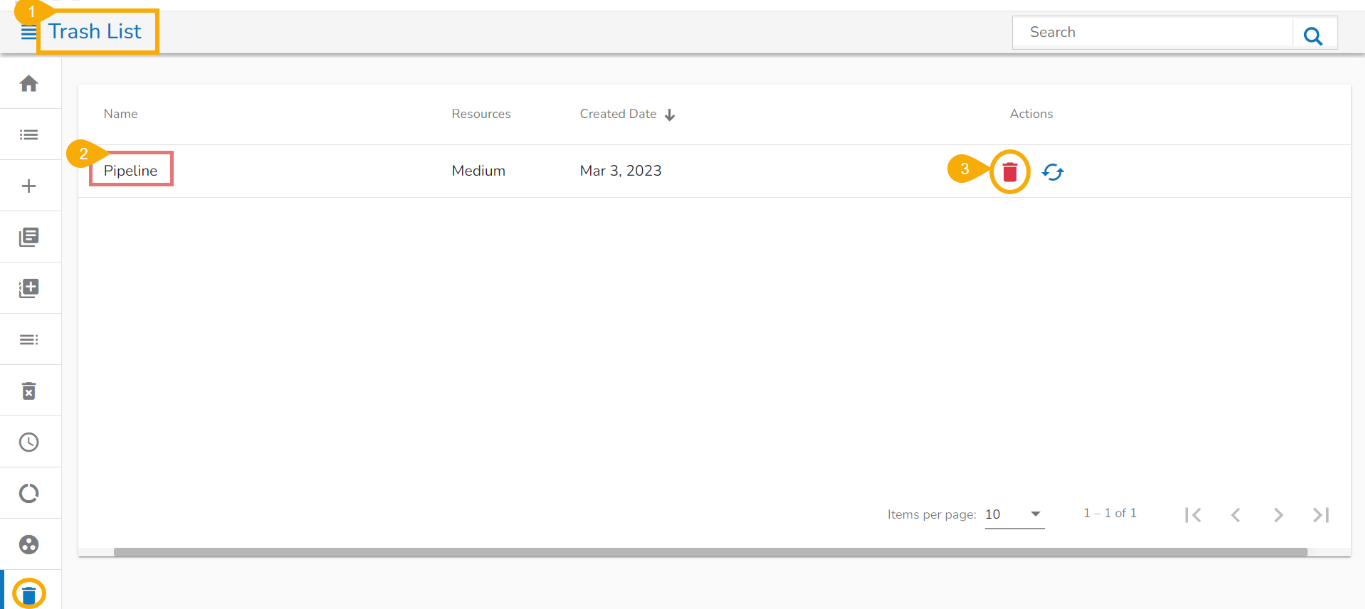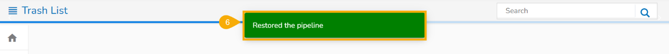 * The ***Trash List*** page opens listing all the deleted pipelines by a user from a user specific account.