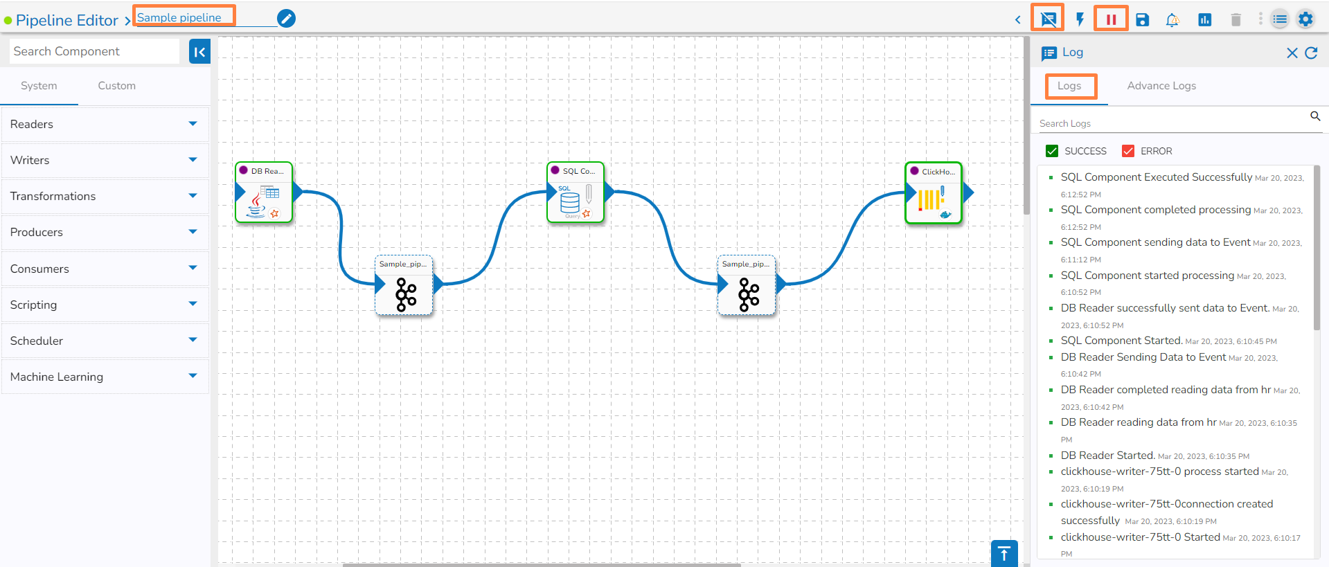 * A ***Log*** panel toggles displaying the collective component logs of the pipeline under the **Logs** tab.     &#x20;