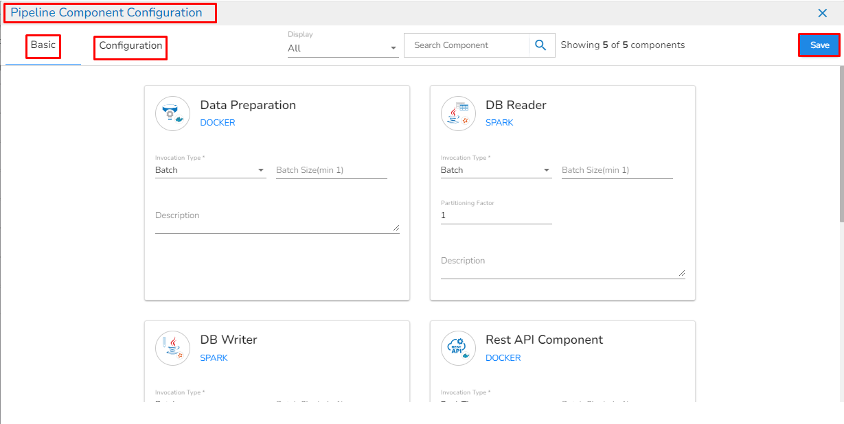 All the components used in the selected pipeline will be listed on the configuration page.