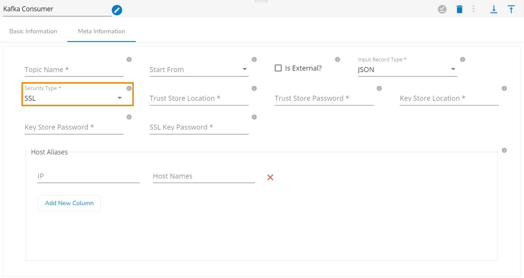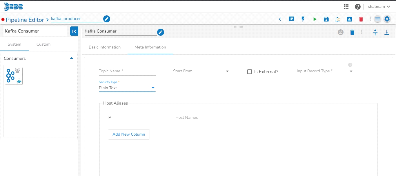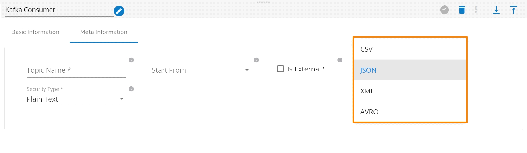 Is External: The user can consume external topic data from the external bootstrap server by enabling the Is External option. The Bootstrap Server and Config fields will display after enabling the Is External option.