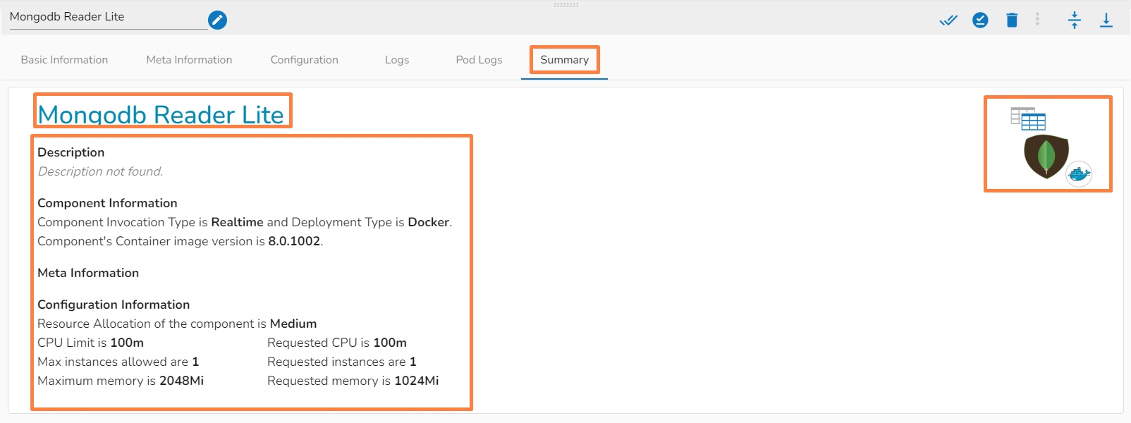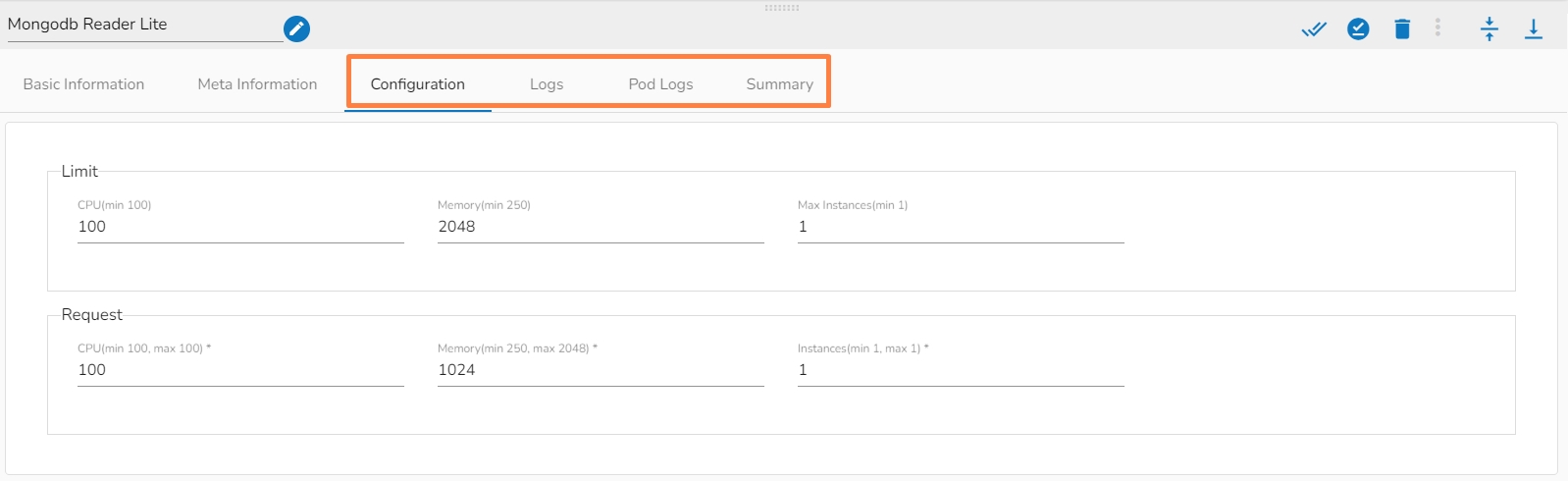 A configured component will display some more tabs such as the Configuration, Logs, and Pod Logs tabs (as displayed below for the Mongodb Reader Lite component).