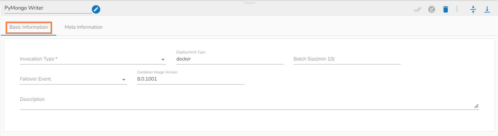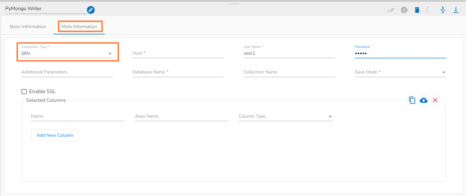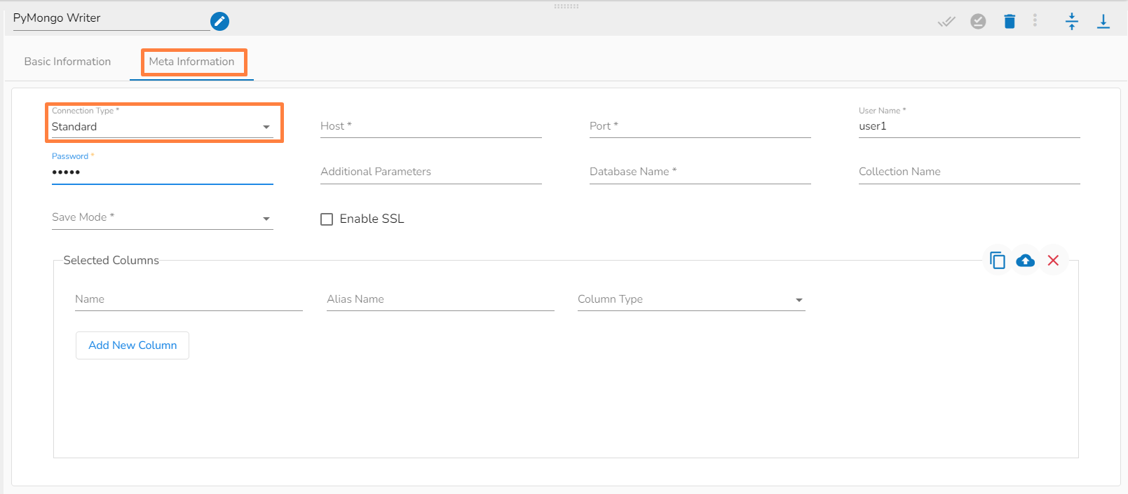 Open the Meta Information tab and configure all the connection-specific details for the PyMongo Writer.