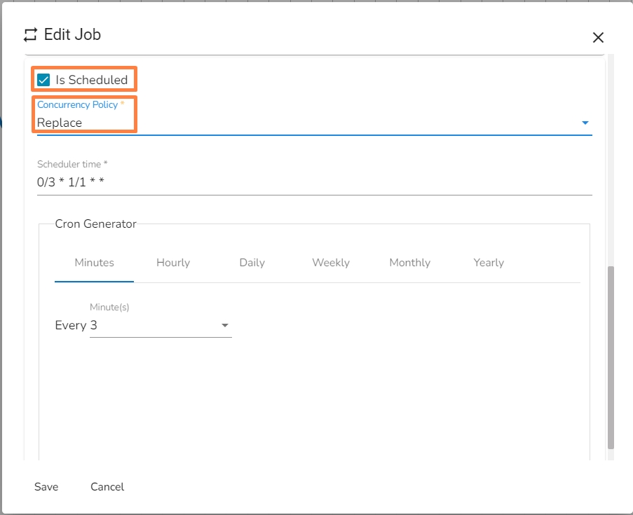 Forbid concurrency policy Replace: If a job is scheduled for a specific time and the first process is not completed before the next scheduled time, the previous task will be terminated and the new task will start processing.