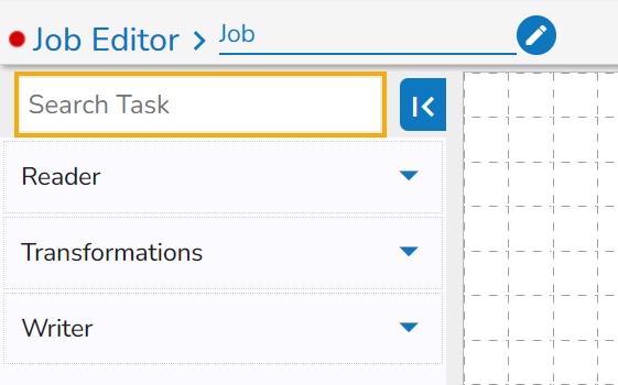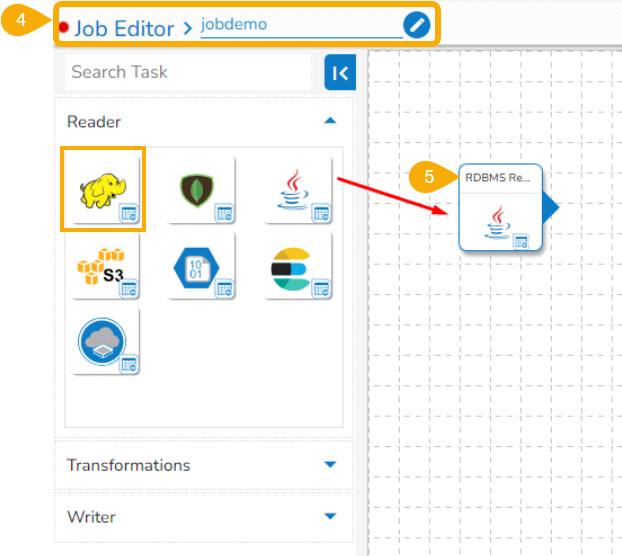 Once the Job gets saved in the Job list, the user can add a Task to the canvas. The user can drag the required tasks to the canvas and configure it to create a Job workflow or dataflow.