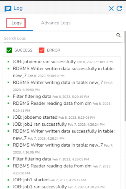 The Toggle Log Panel displays the Logs and Advanced Logs tabs for the Job Workflows.