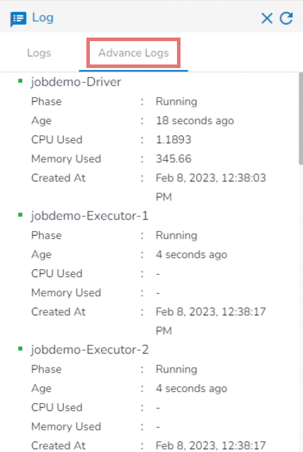 Select the Advanced Logs tab to display the pod status of the complete Job.