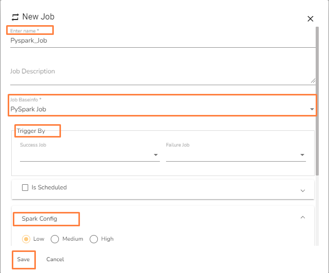 Job Baseinfo: Select PySpark Job option from the drop in Job Base Information.