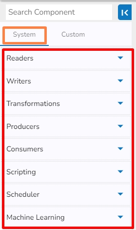 The Component Pallet is situated on the left side of the User Interface on the Pipeline Workflow. It has the System and Custom components tabs listing the various components.