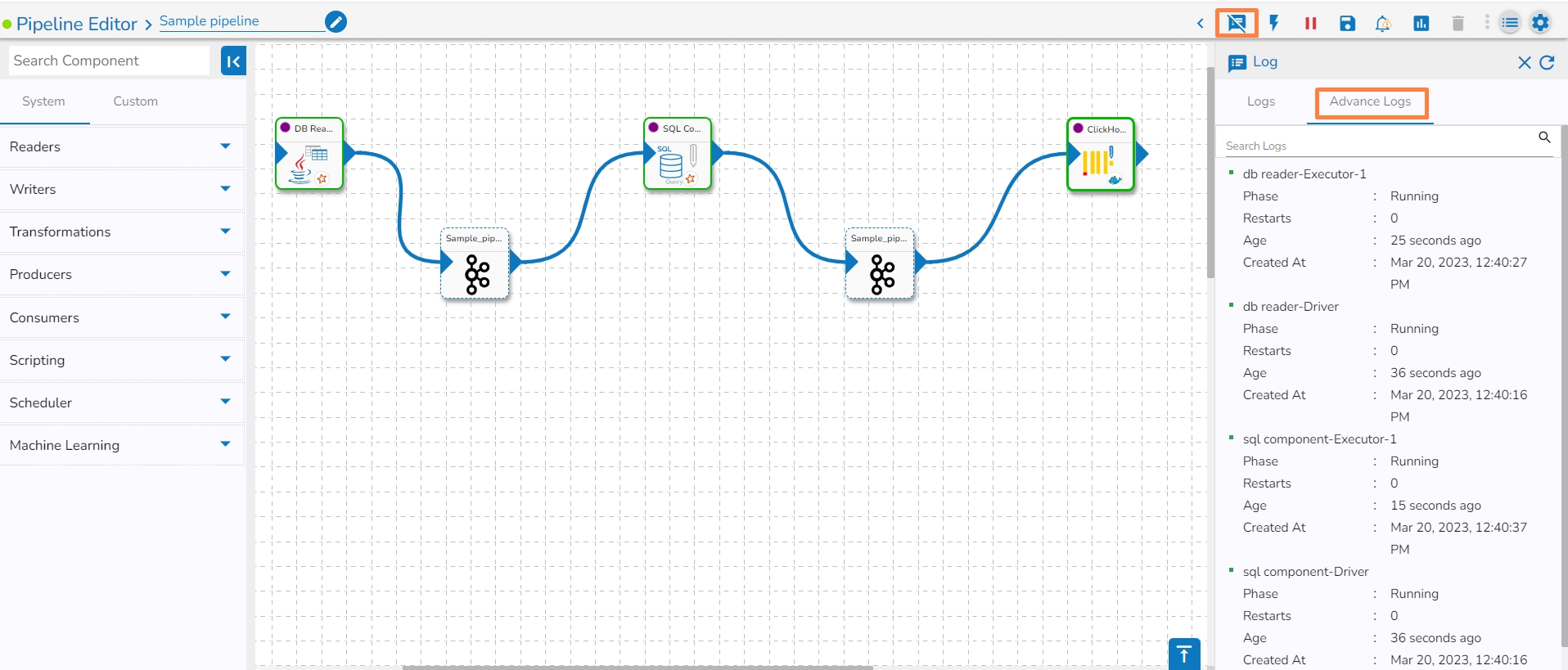 A Log panel toggles displaying the collective component logs of the pipeline under the Logs tab.