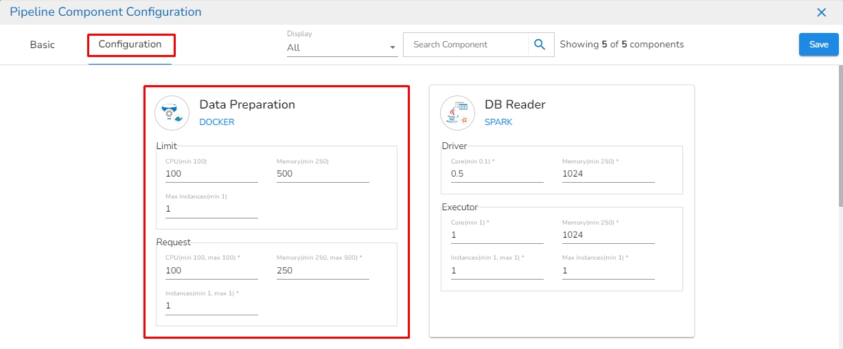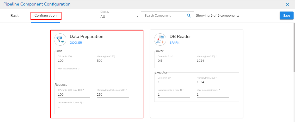 On the Configuration tab, the user can provide resources such as memory and CPU to the components, as well as set the number of instances for the components.