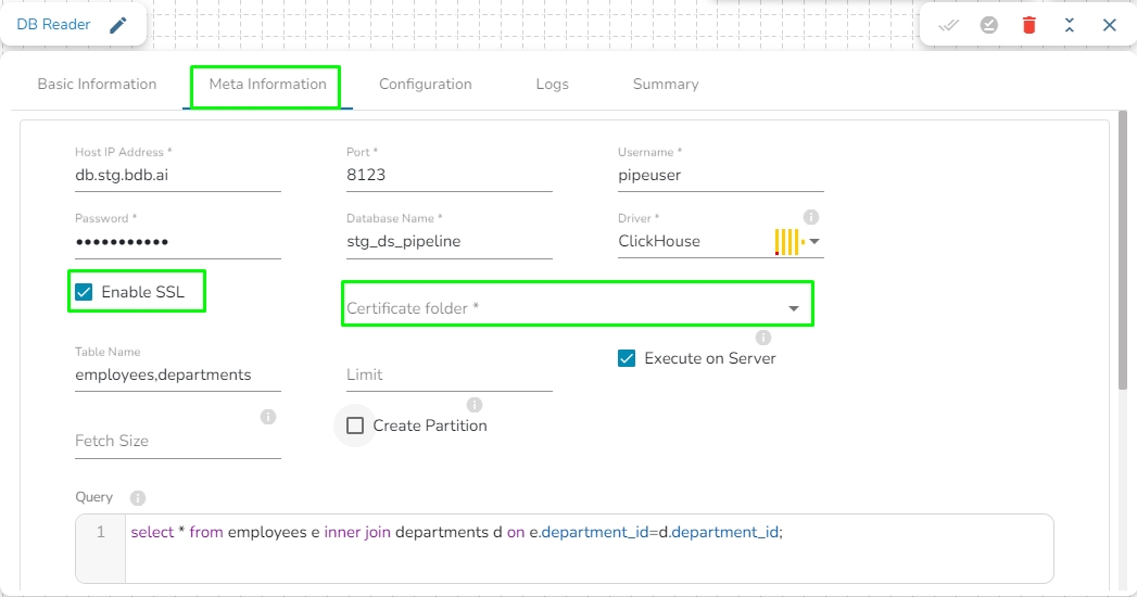 Enable SSL: Check this box to enable SSL for this components. Enable SSL feature in DB reader component will appear only for two(2) drivers: PostgreSQL and ClickHouse.