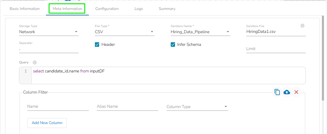 Column Filter: There is also a section for the selected columns in the Meta Information tab if the user can select some specific columns from the table to read data instead of selecting a complete table so this can be achieved by using the Column Filter section. Select the columns which you want to read and if you want to change the name of the column, then put that name in the alias name section otherwise keep the alias name the same as of column name and then select a Column Type from the drop-down menu.