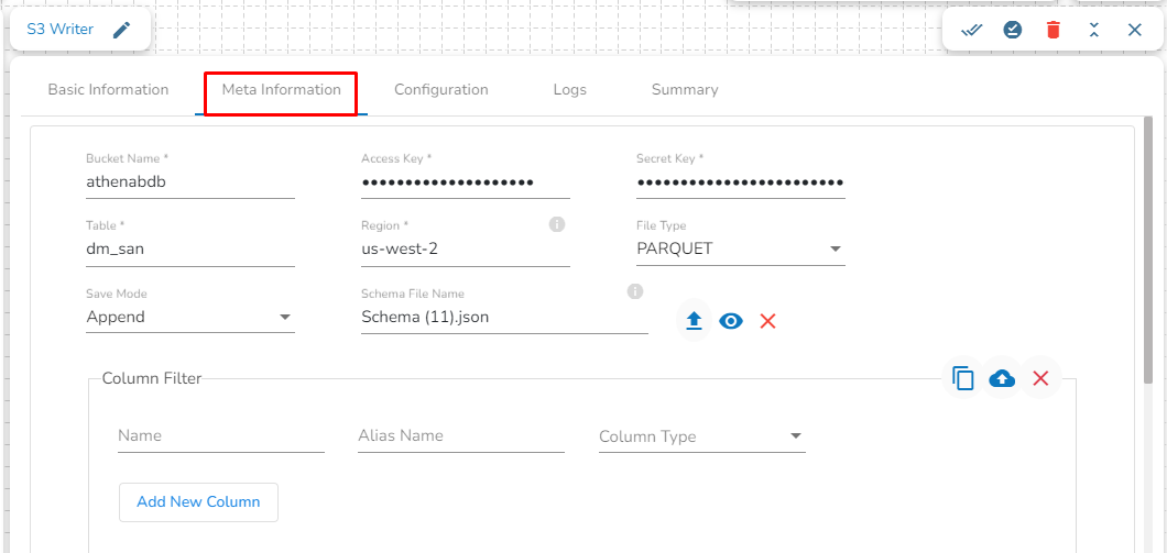 Configuring the Meta Information tab of the S3 Writer