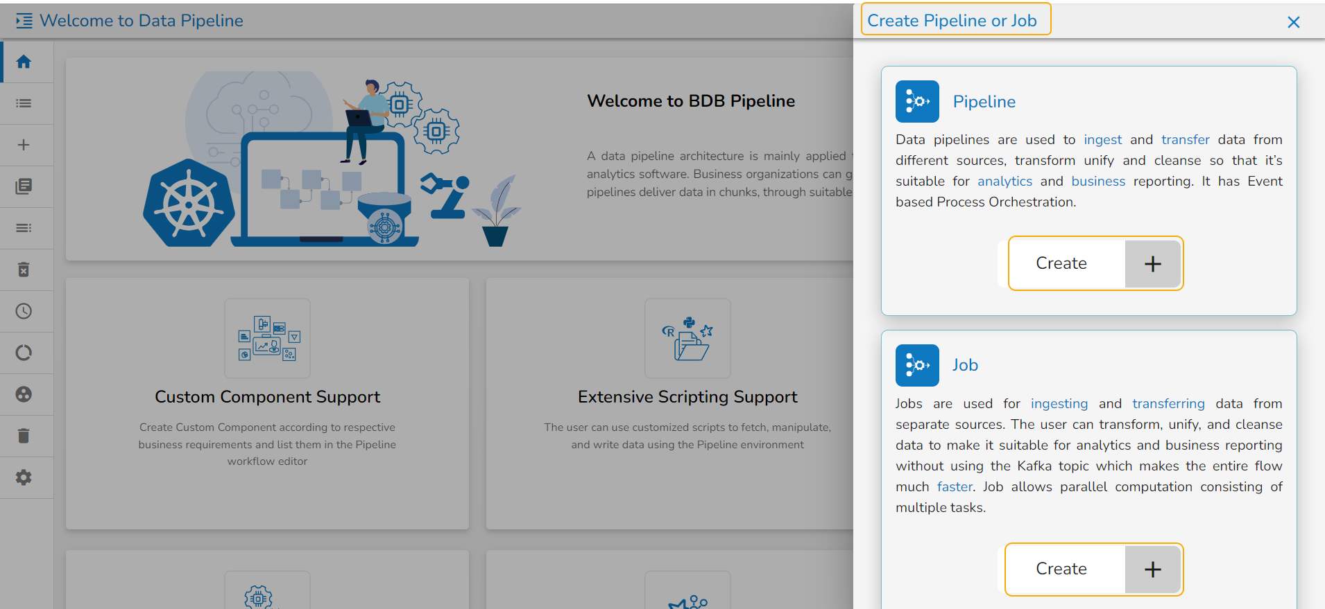 *<mark style="color:green;">Please Note:</mark> Based on your selection, the next page opens. Refer the **Create a New Pipeline** and **Create a Job** sections to get the details.*