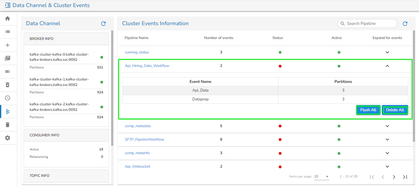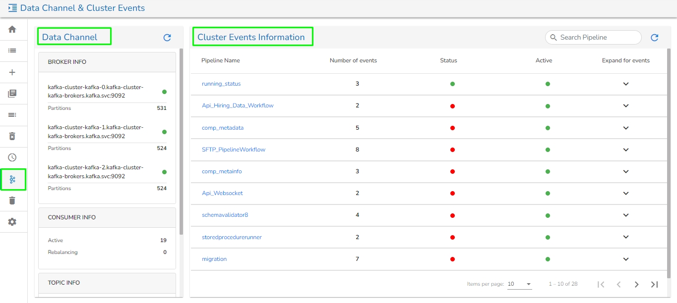 The list opens displaying the Data Channel & Cluster Events information. The Data Channel includes Broker Info, Customer Info and Topic Info information and the Cluster events includes Pipeline name, Status, Number of events and Expand for Events information.
