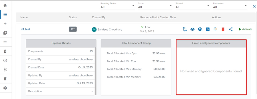 The user can activate/deactivate the pipeline by clicking on the Activate/ Deactivate icon.